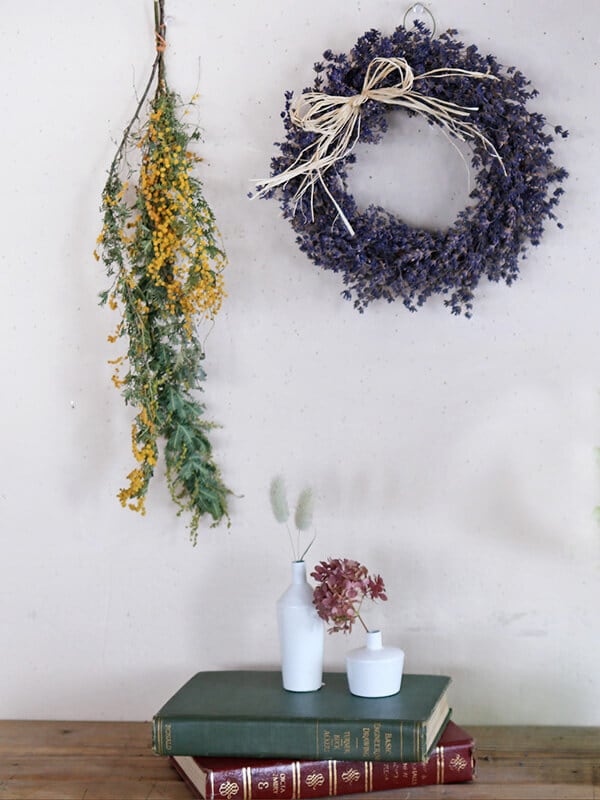 ドライフラワー ミモザとあじさいのリース ◆ 黄色いお花がかわいいナチュラルインテリアに人気のミモザのドライフラワーリース