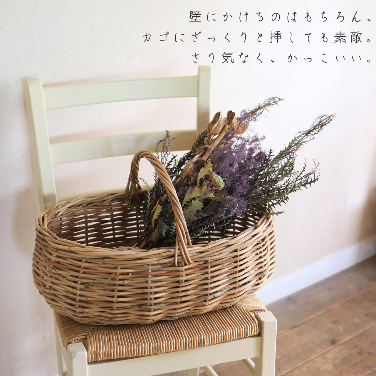 壁掛け用の紐がついたスワッグタイプなので、壁にかけて飾るのはもちろんですが、カゴに入れてもおしゃれ。