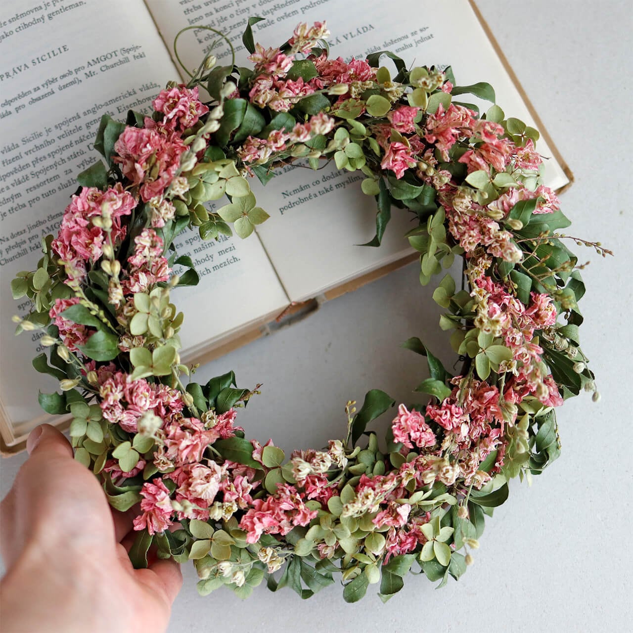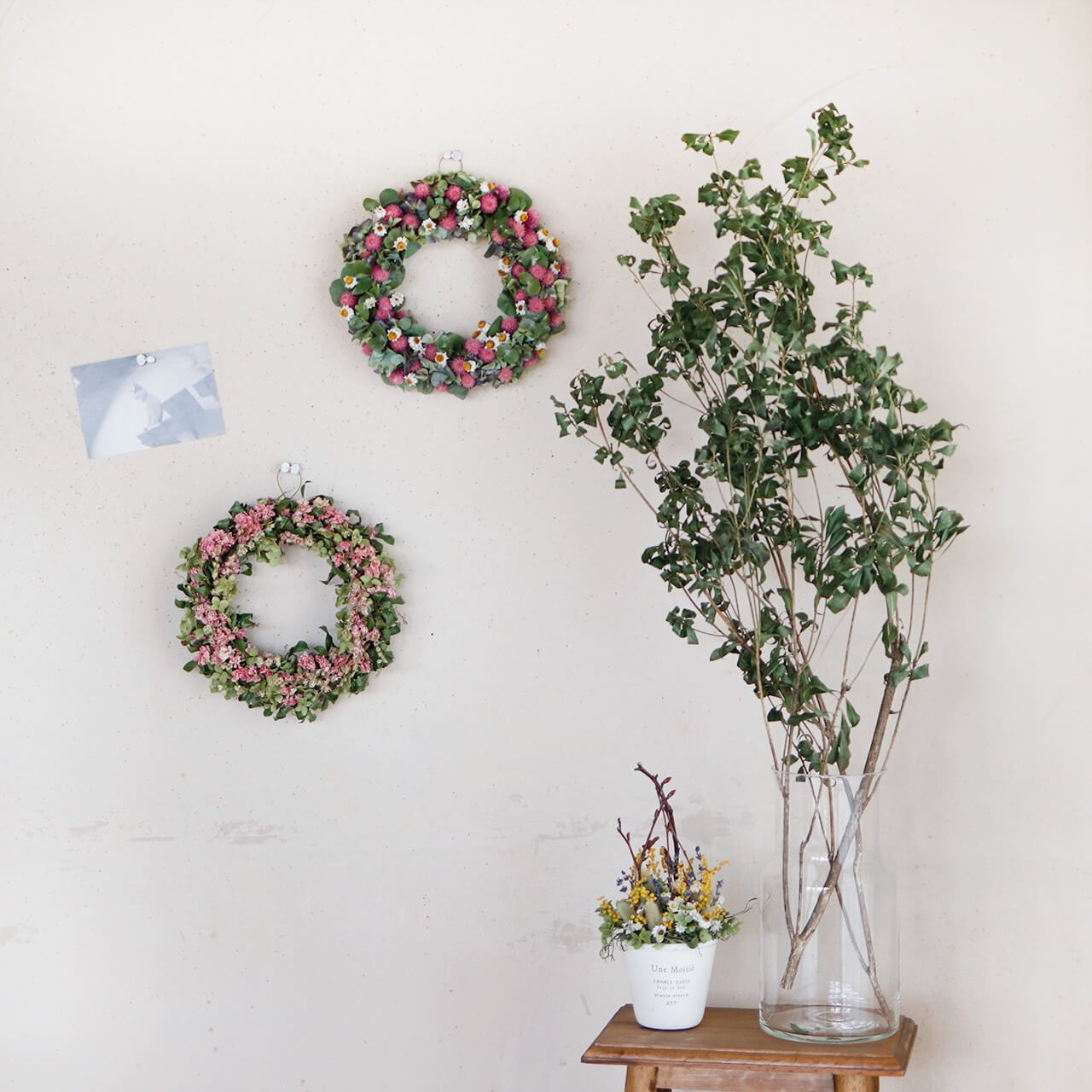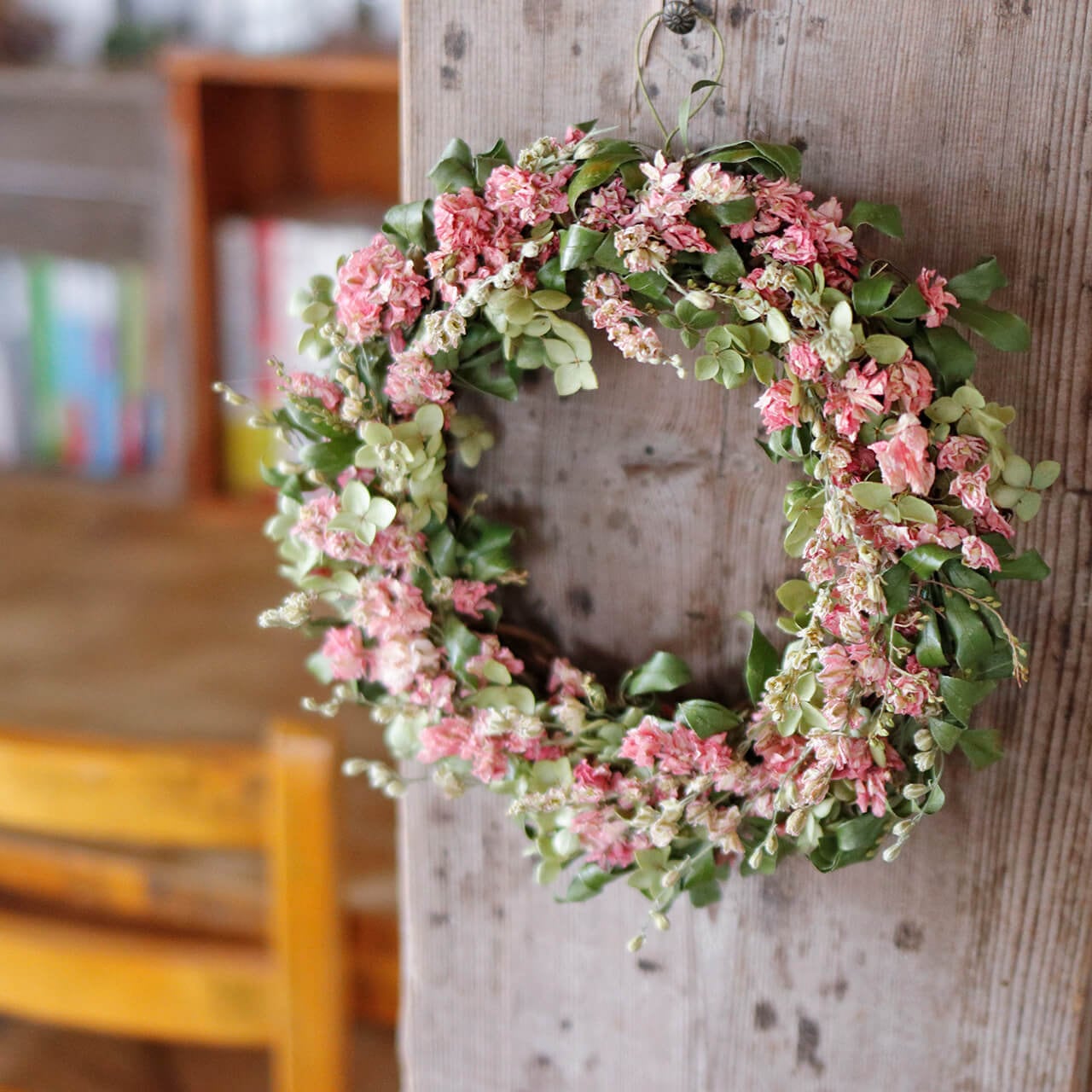 ナチュラルなグリーンのドライフラワーリースはお部屋にさり気ない色どりを添えてくれます♪