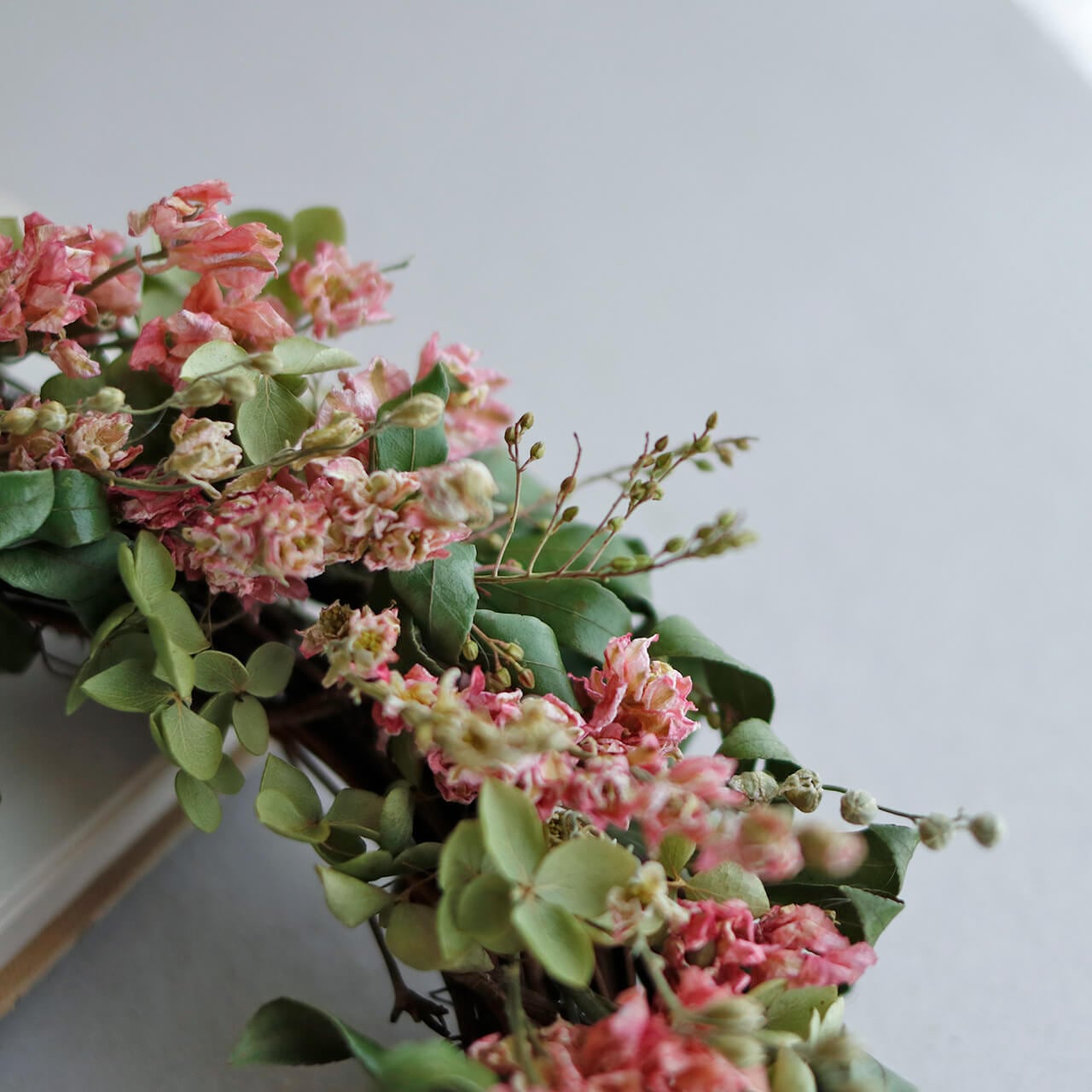 ●素材:ちどり草(ラークスパー)ピンク・アジサイアナベル・あせび(ドライフラワー)