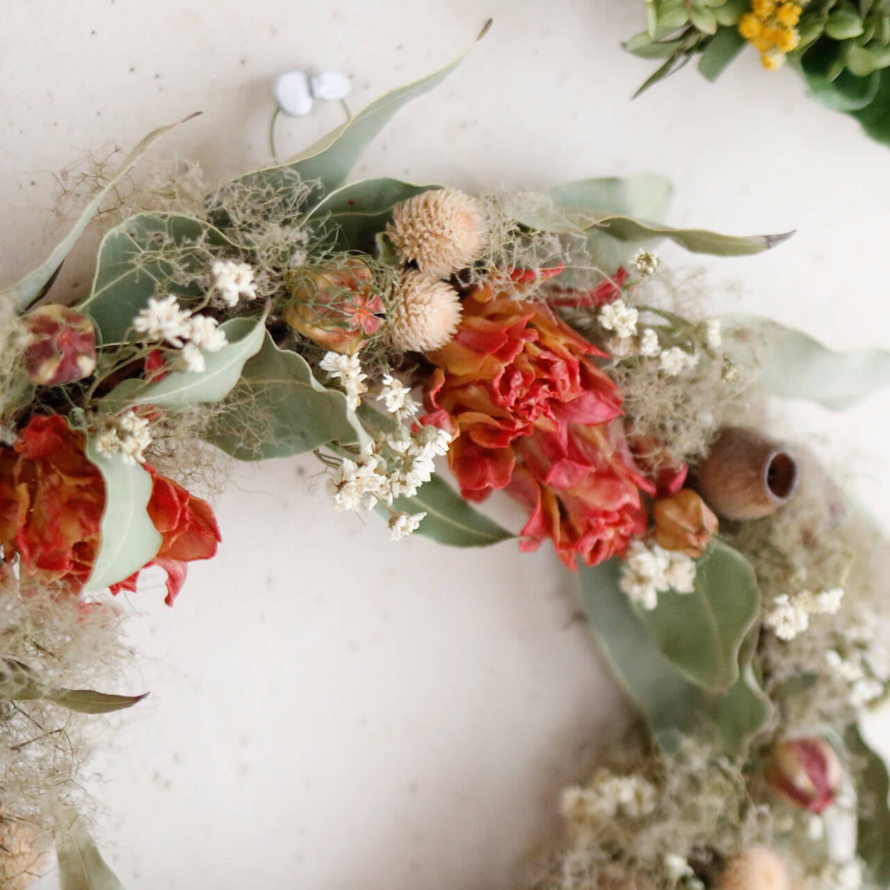 ナチュラルなオレンジグリーンのドライフラワーリースはお部屋にさり気ない色どりを添えてくれます♪