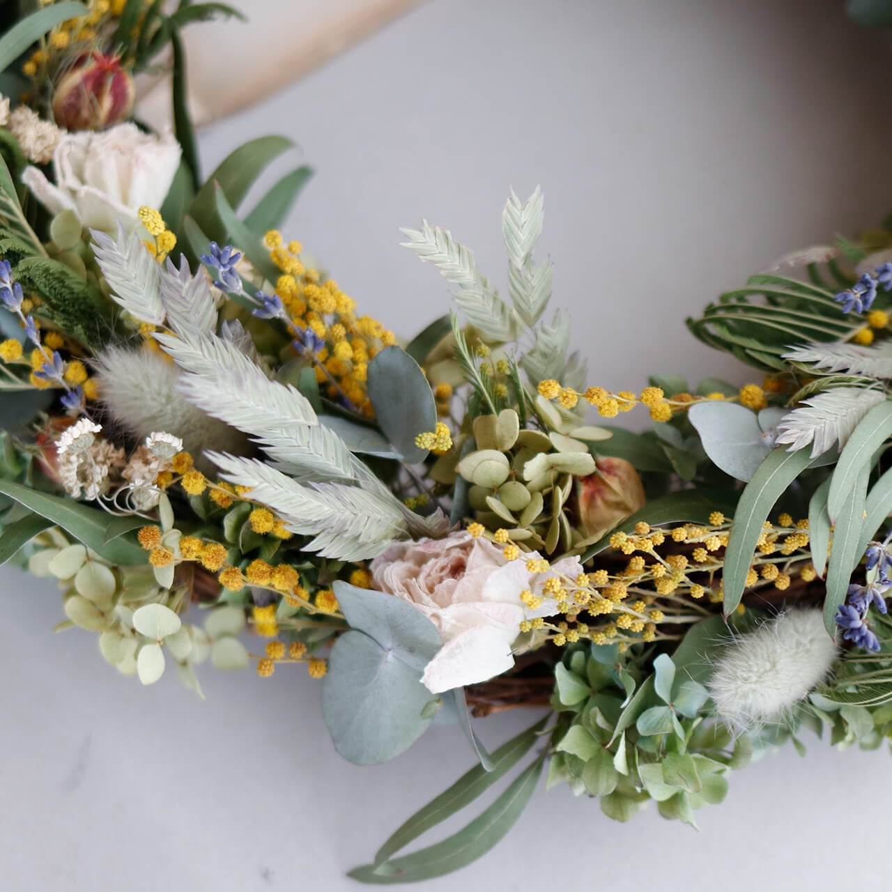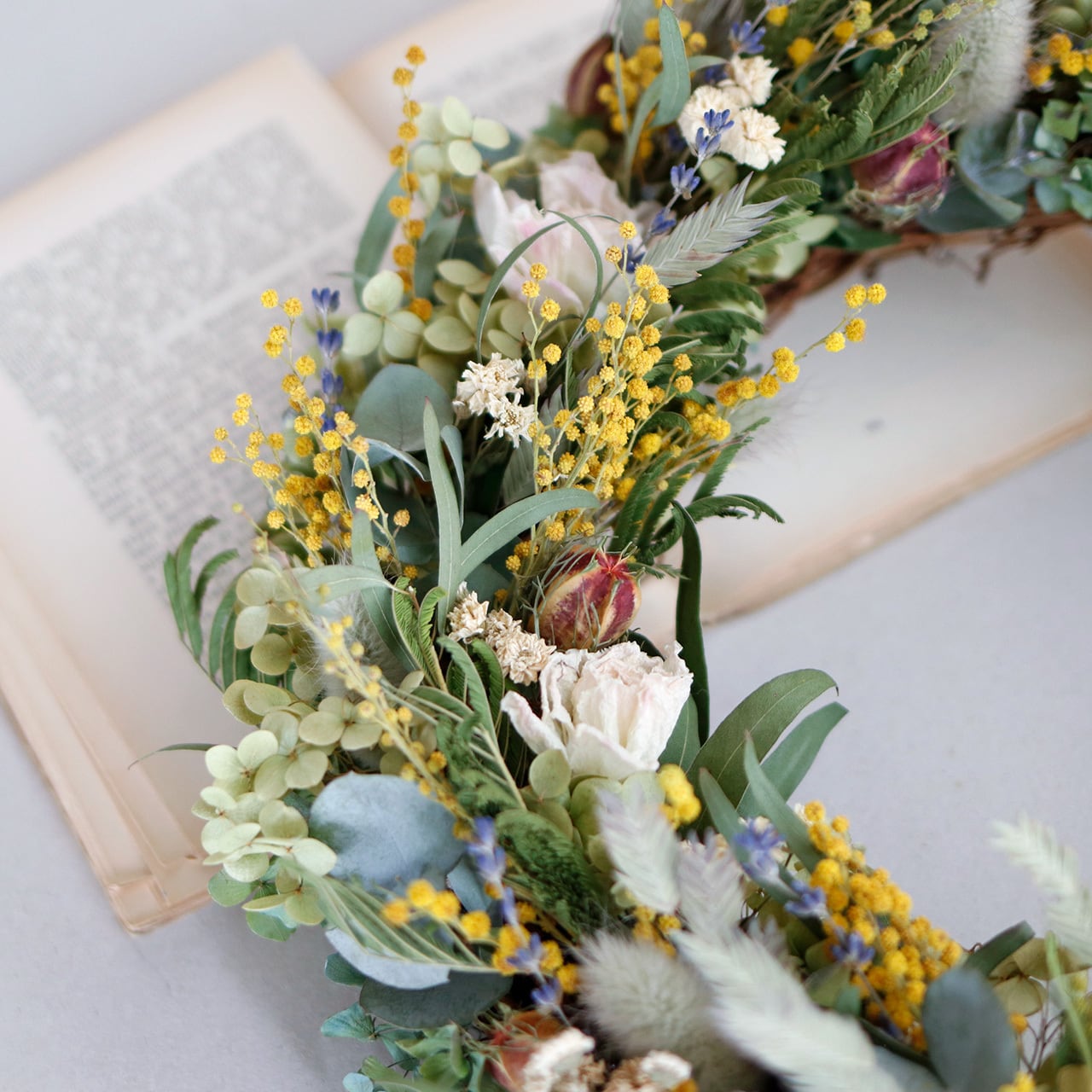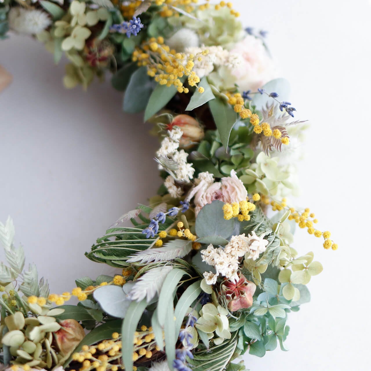 ・素材:ミモザ・ラナンキュラス・ラグラス・富良野産ラベンダー4号丘紫・アキレアパール・アジサイアナベル・ニゲラ・ユーカリニコリ・ユーカリ銀世界・ワイルドオーツ・あじさい(すべてドライフラワー)