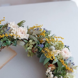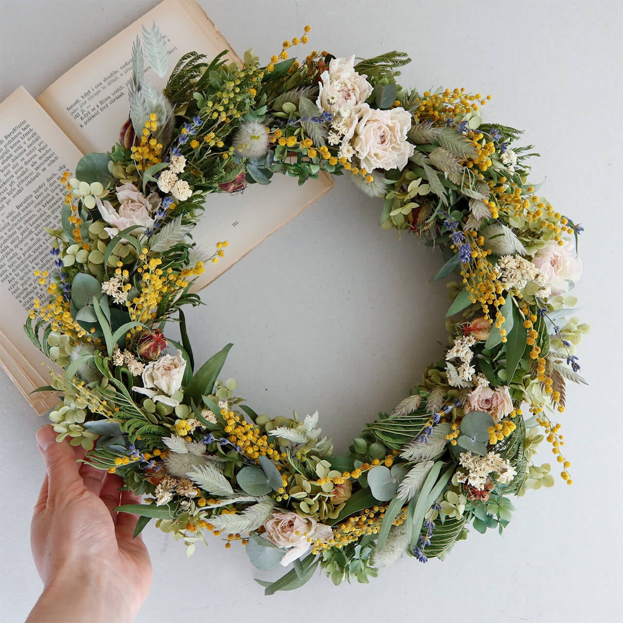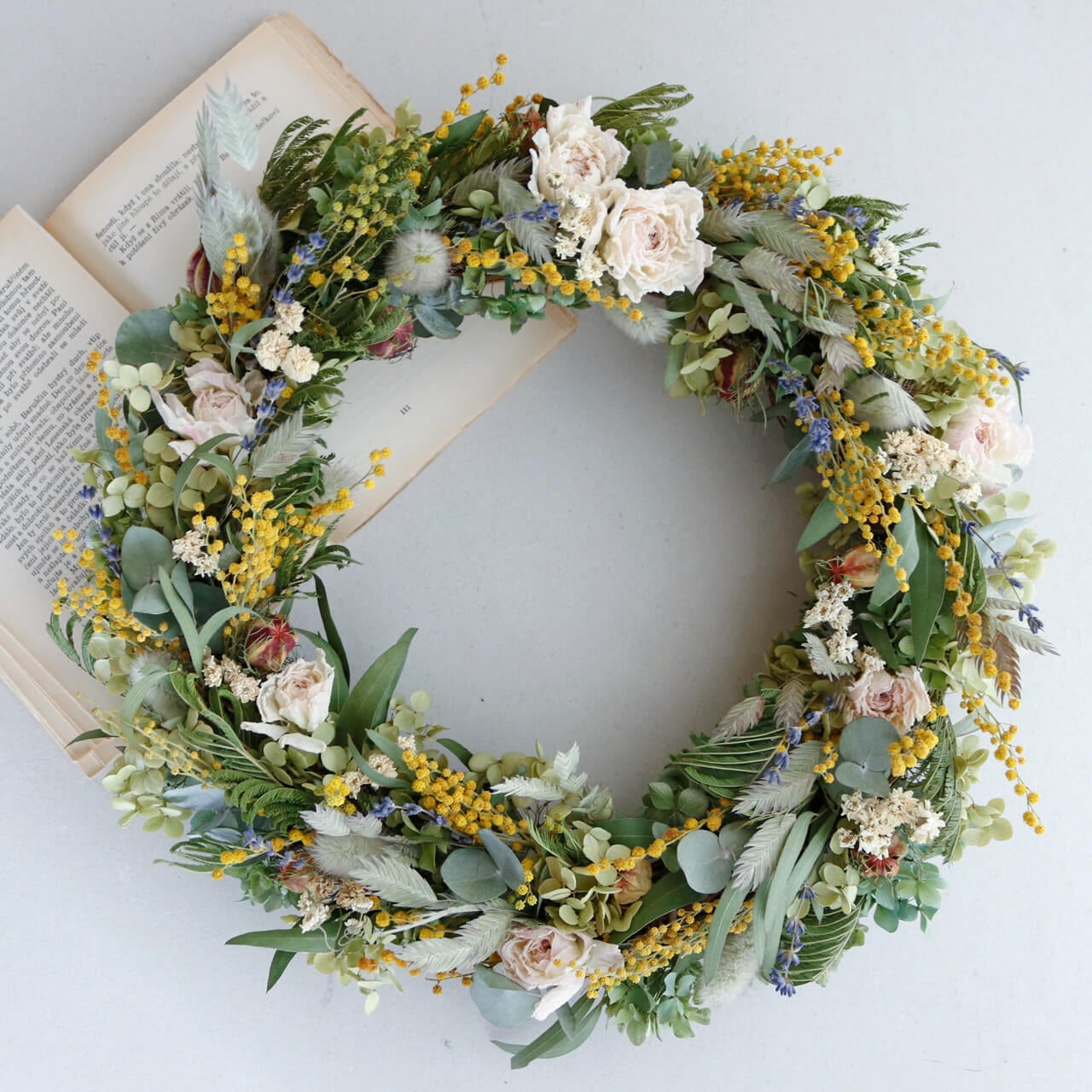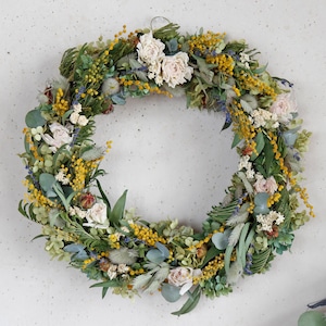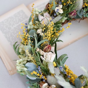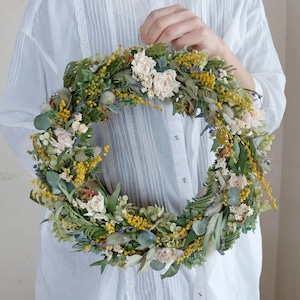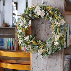 【約直径36cm】春色ラナンキュラスとミモザの大きなフラワーリース * ドライフラワー ミモザ リース かわいい 北欧インテリア 開店祝い プレゼント 誕生日 ギフト ひな祭り バレンタインデー 母の日 ナチュラル 特大