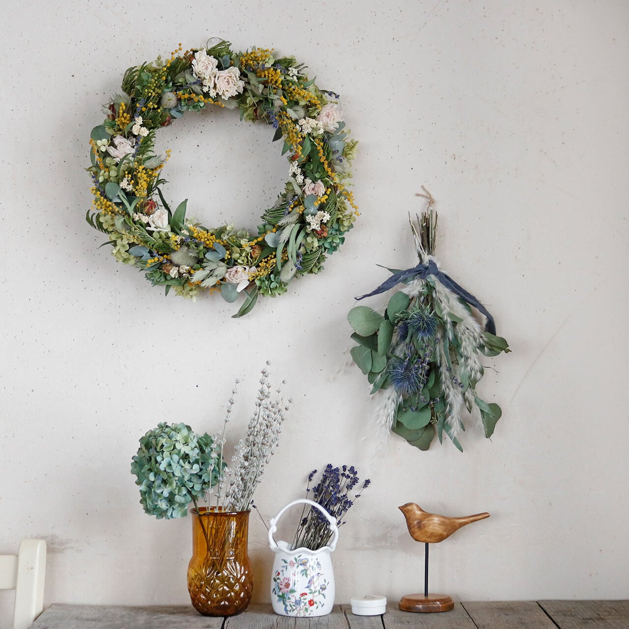 ドライフラワーグリーンや枝物とあわせてお部屋をナチュラルヒュッゲな北欧インテリアに。