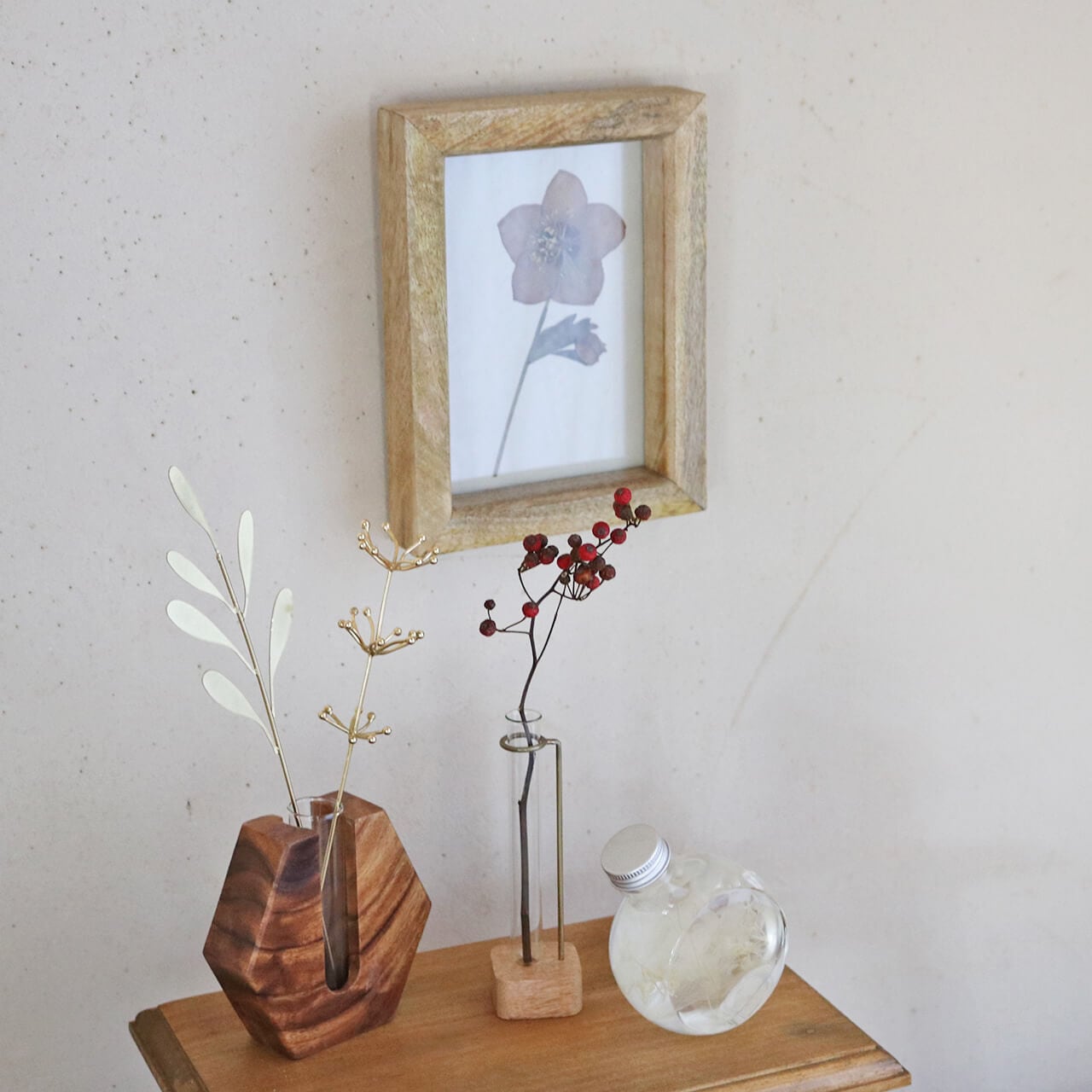 ユーカリや野バラの実、ミモザなど、ちょこっとドライフラワーを飾るのにぴったり。