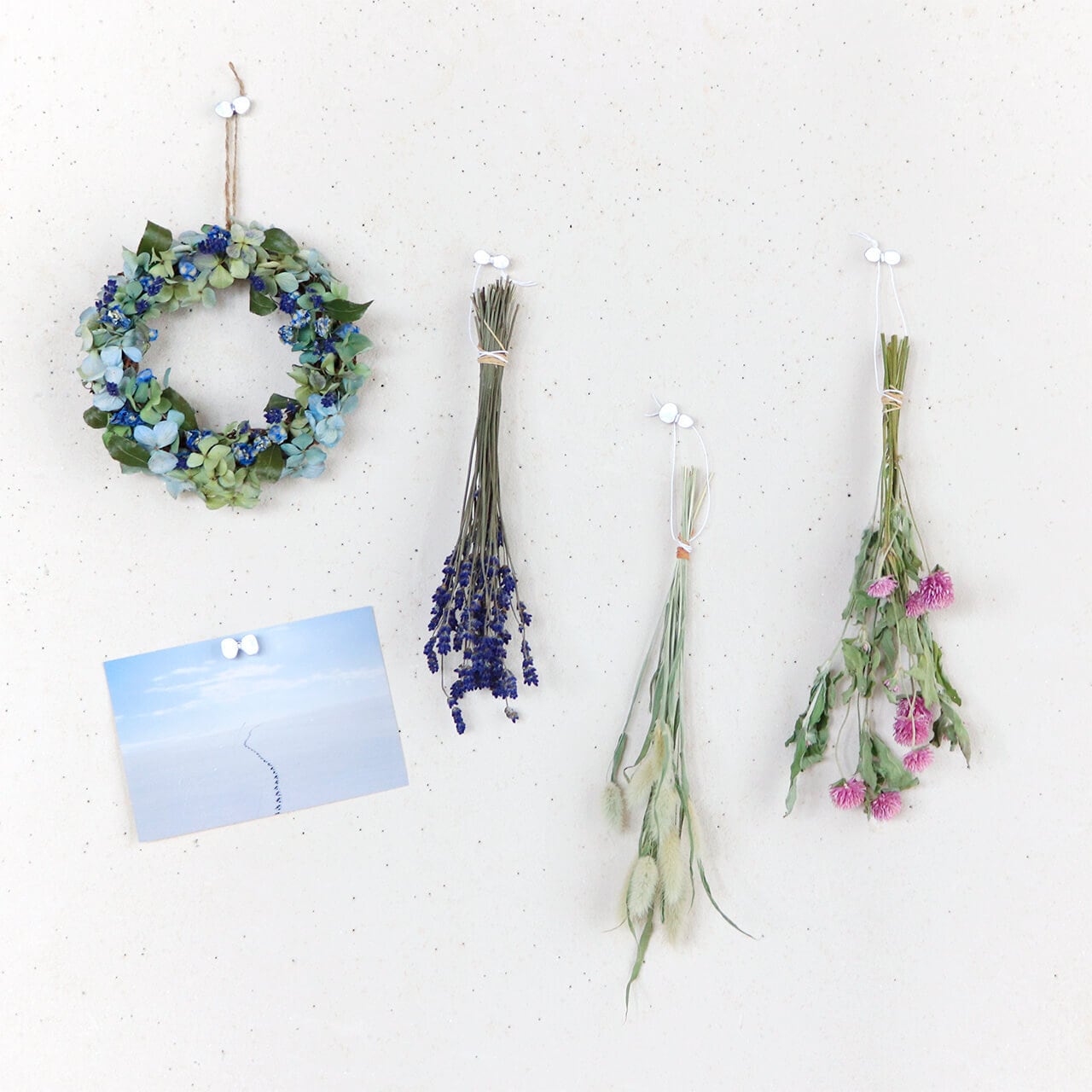 3種のドライフラワーを吊るす。