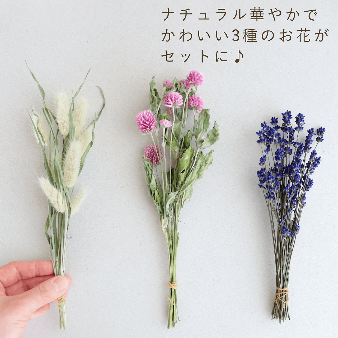 春色かわいい ドライフラワー3種セット 千日紅ライラックピンク 富良野ラベンダー ラグラス * 茎付だから吊り下げて楽しめる♪ ナチュラルインテリアにおしゃれな枝もの ♪ 小さい お試しセット 初心者向け * 木の実 ハンドメイド キット 枝もの 木の枝 吊るす 北欧