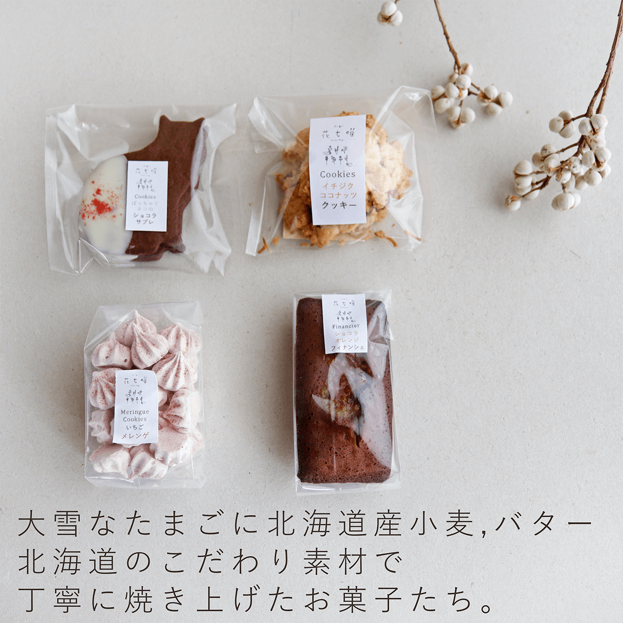 お試しサイズ♪【富良野 花七曜】 4種の焼菓子セット * 個包装 ♪ 北海道 富良野を感じる こだわり 手作り 焼菓子 クッキー 詰め合わせ 大雪なたまご・ 北海道産小麦 バター ネコクッキー 猫 ねこ * 誕生日 母の日 結婚祝い プレゼント 贈り物 ギフト 自分へのご褒美に♪