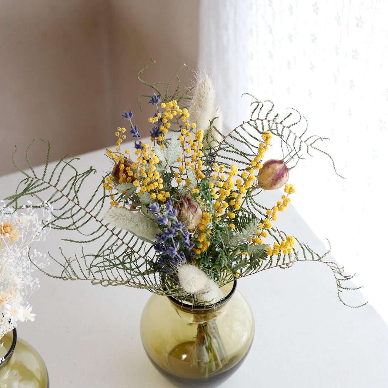・使用花材:ミモザ・富良野ラベンダー4号おかむらさき・シースター・タラスピ・ラグラス・ニゲラ