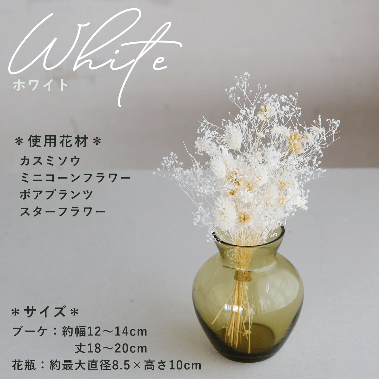 ・使用花材:カスミソウ・ミニコーンフラワー・ポアプランツ白・スターフラワー(プリザーブドフラワー・ドライフラワー)