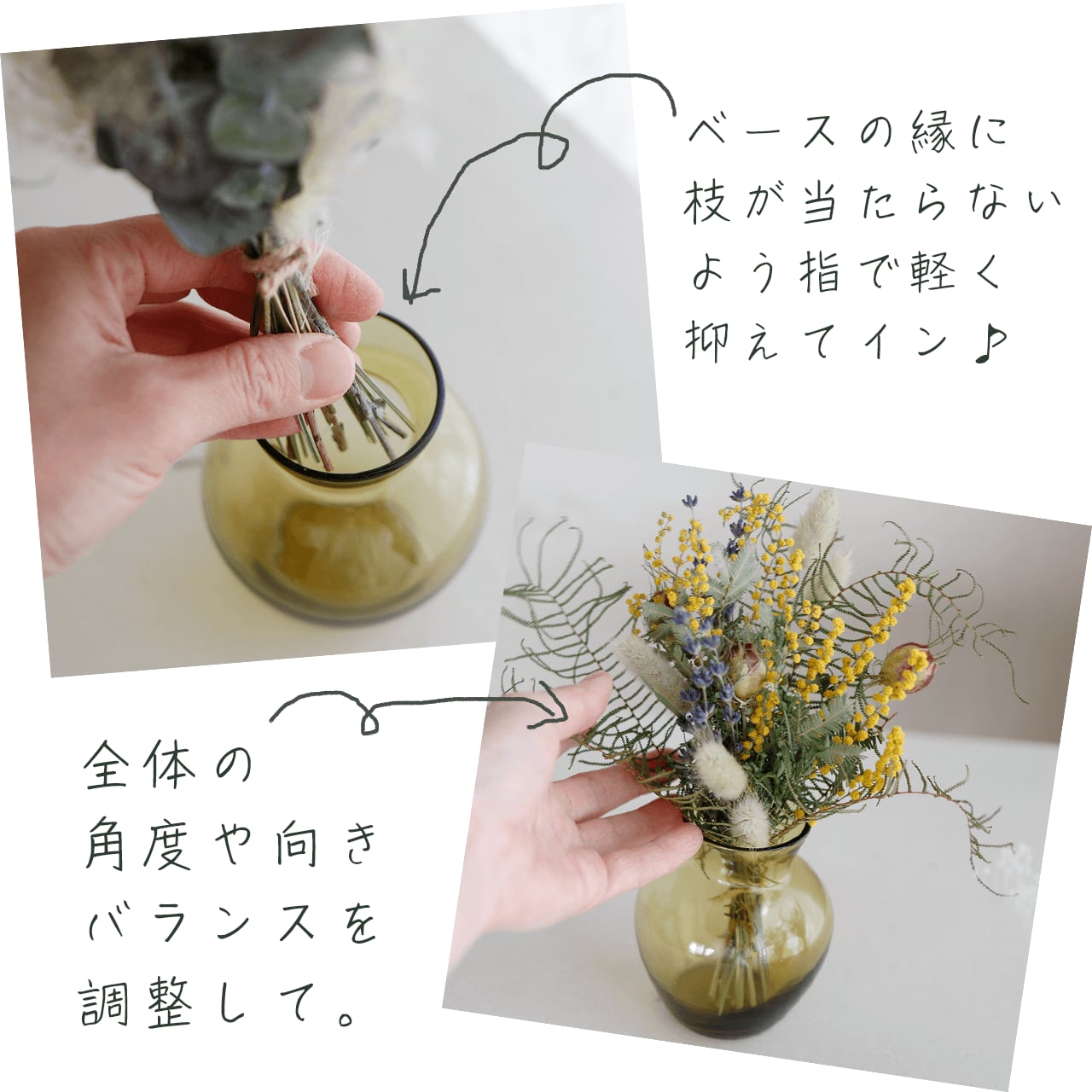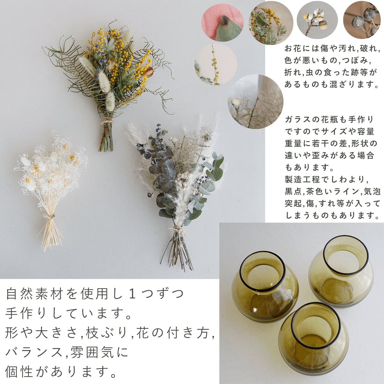 ◆ブーケは自然素材を使用したハンドメイド製品ですので形・大きさ・色・お花のバランス・ボリュームに多少個性があります。 ◆ドライフラワー・プリザーブドフラワーは多少葉や花が落ちたり、色むらや傷、汚れ、虫食いの跡、折れなどがある場合があります。