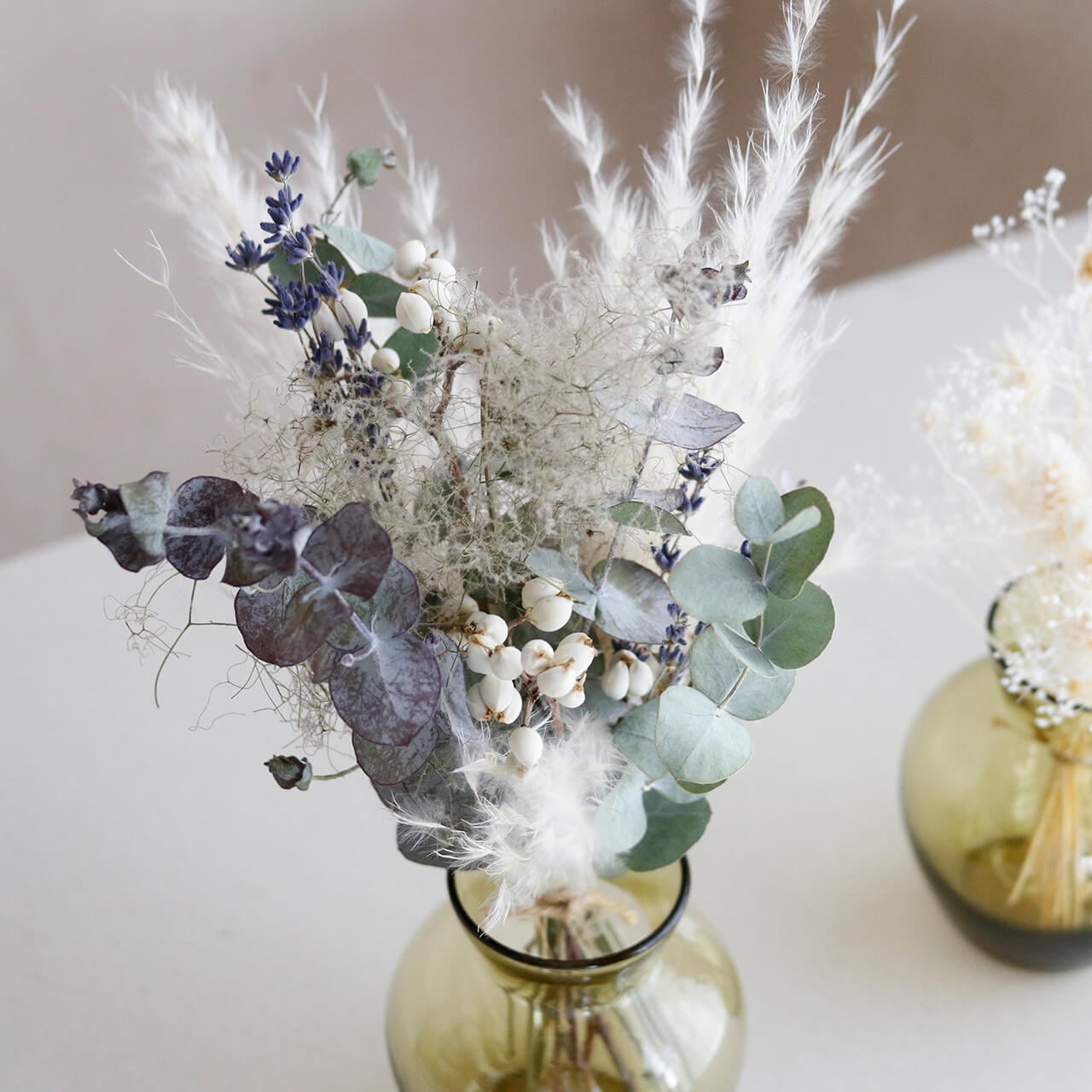 ユーカリとスモークツリーのシックなグリーンが大人っぽい