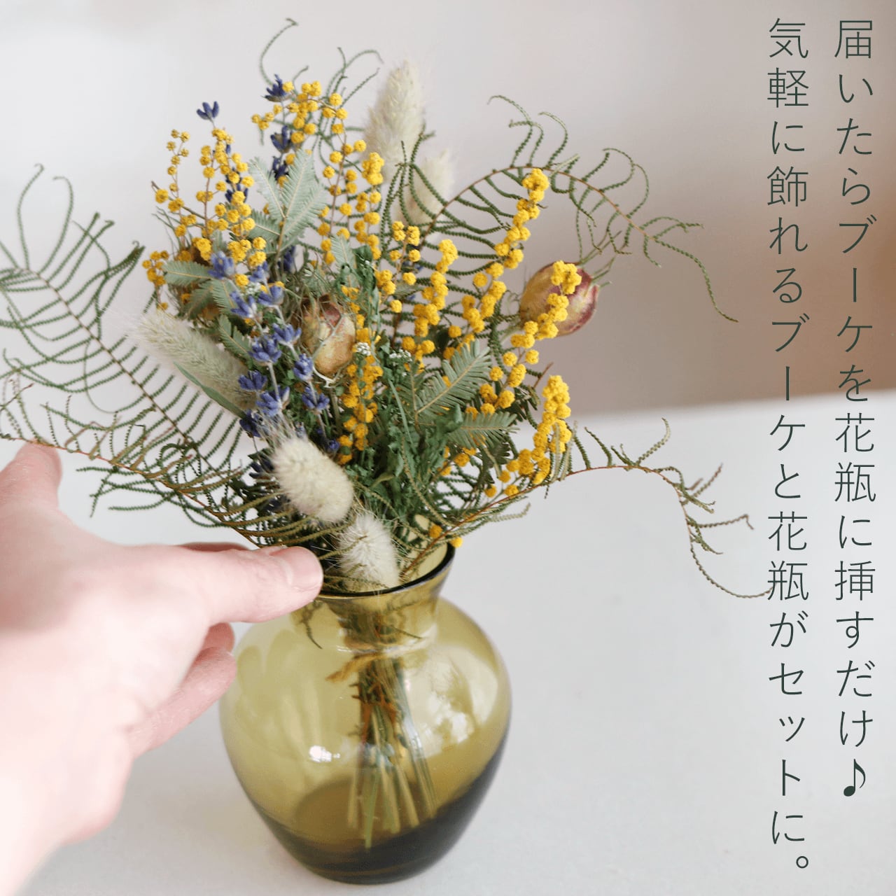 そのまま飾れる♪ ドライフラワーブーケ & ガラス花瓶 セット A* 富良野ラベンダー ミモザ ユーカリ * おしゃれ ナチュラルインテリアにフラワーベースとお花セット 飾り方 グリーン ブーケ 花束 母の日ギフト 誕生日 プレゼント プチギフト ドライフラワーセット