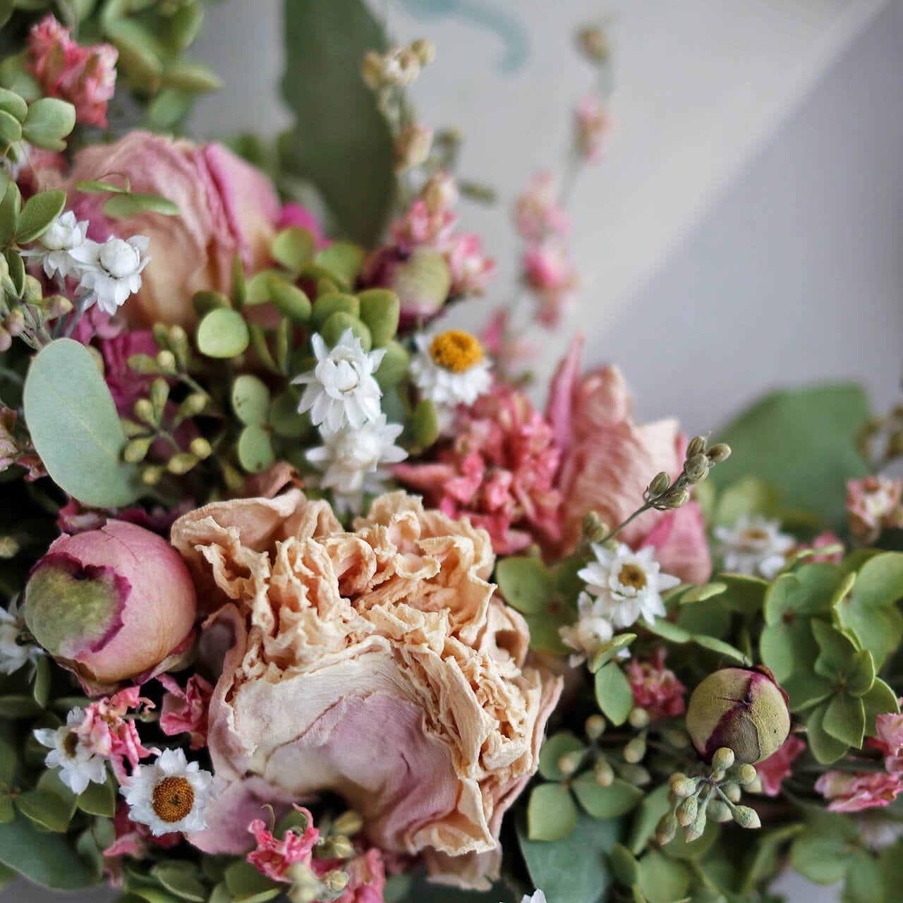 ●素材:シャクヤク八重咲ソフトピンク・ラークスパーピンク(ちどり草)・アンモビューム・ユーカリポポラスベリー(ドライフラワー)