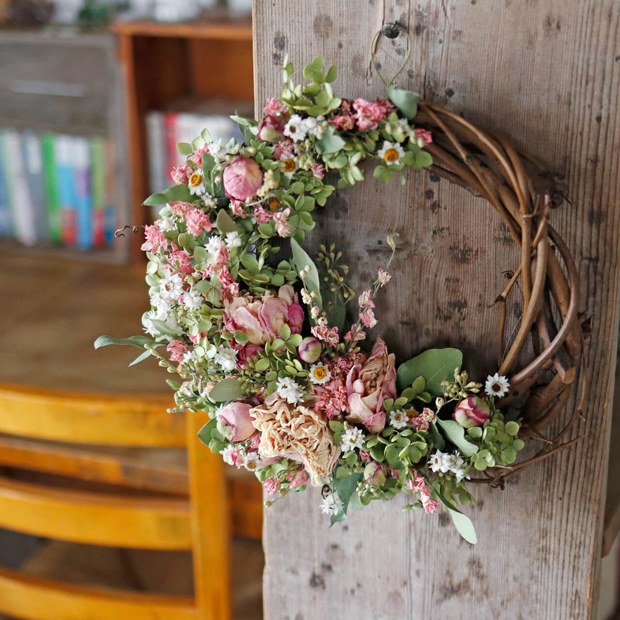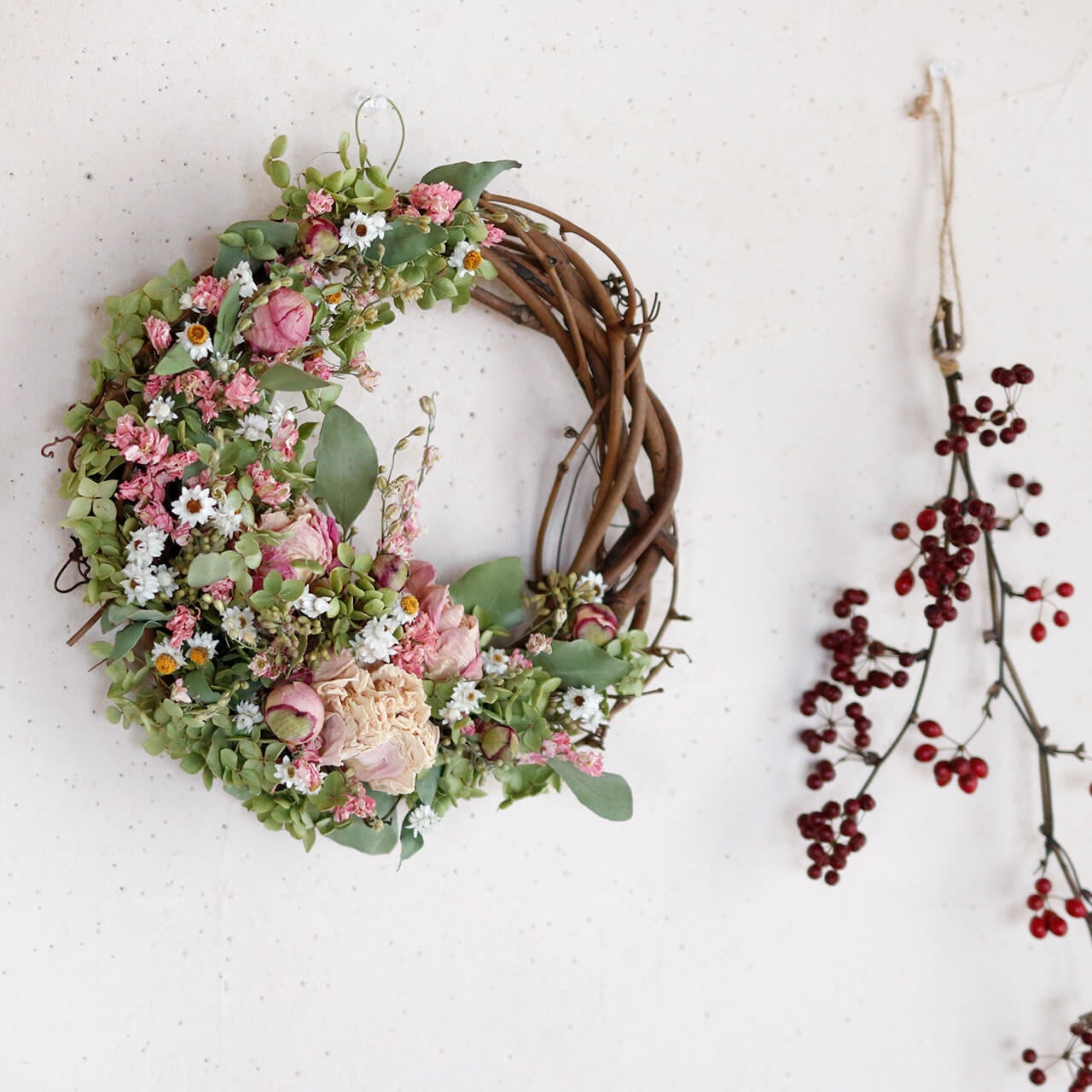 ナチュラルなピンクグリーンのドライフラワーリースはお部屋にさり気ない色どりを添えてくれます♪