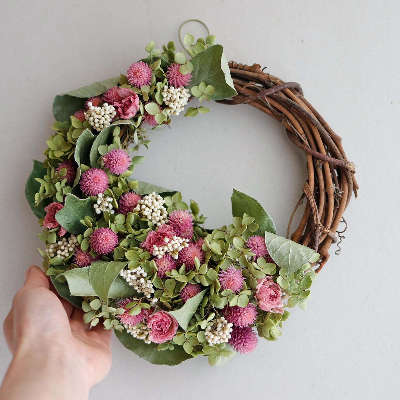 ナチュラルなピンクグリーンのドライフラワーリースはお部屋にさり気ない色どりを添えてくれます♪