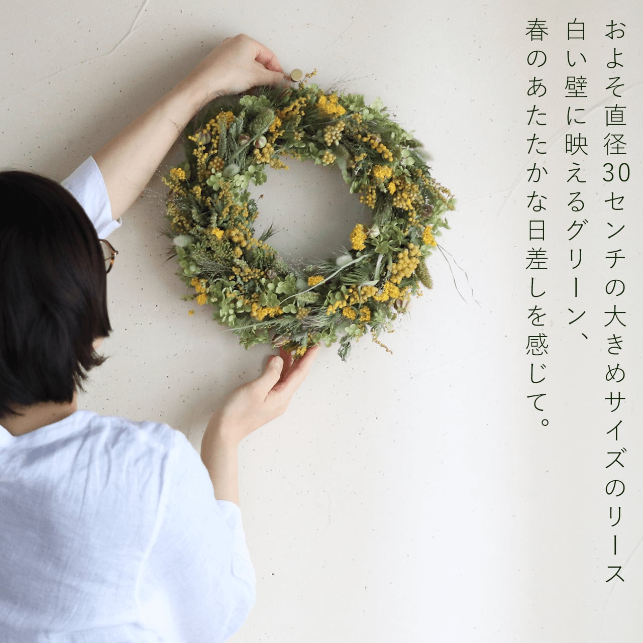 グリーンの野原に黄色い丸いポンポンのようなミモザやキバナローダンセのお花が咲く、素朴でナチュラルなイエローリース。