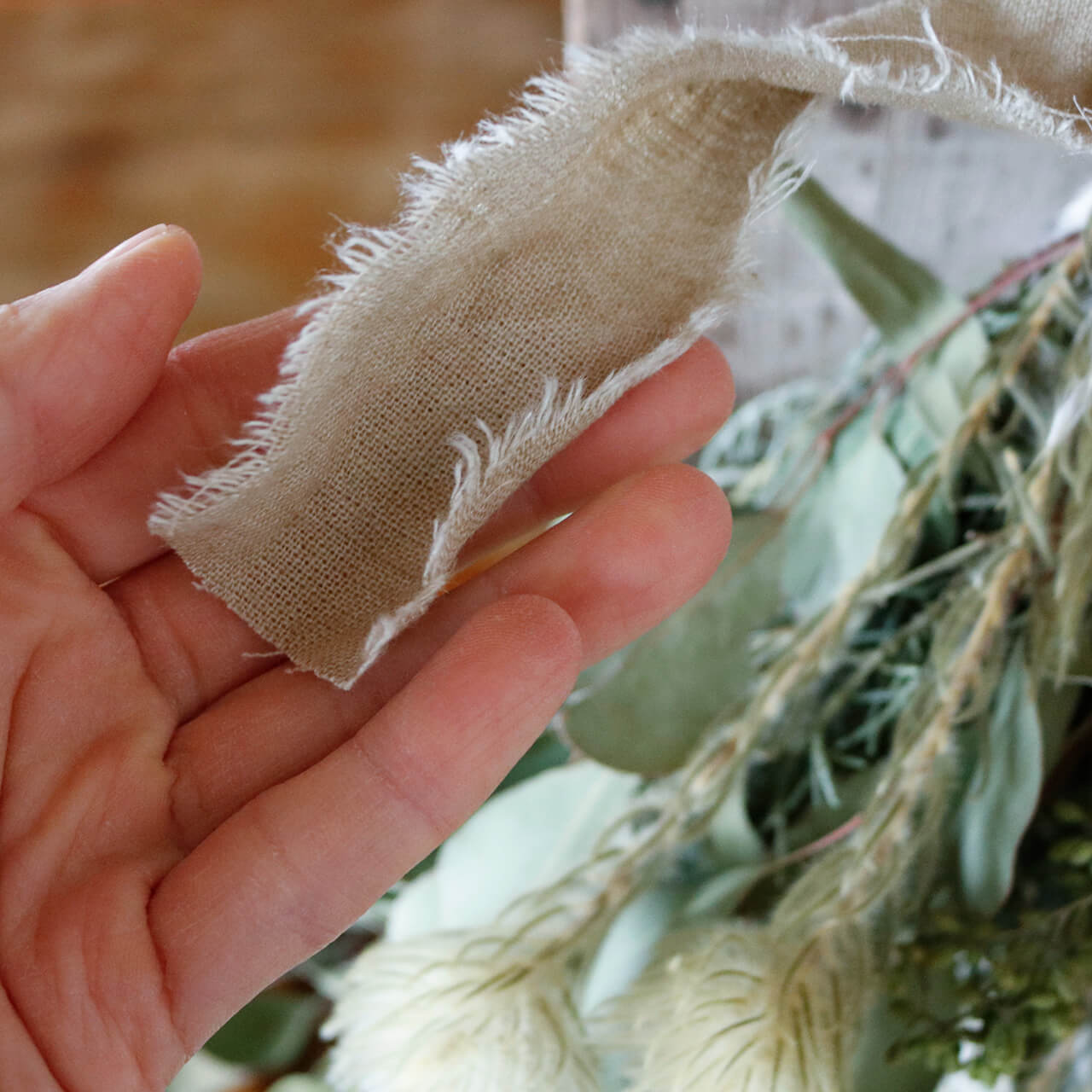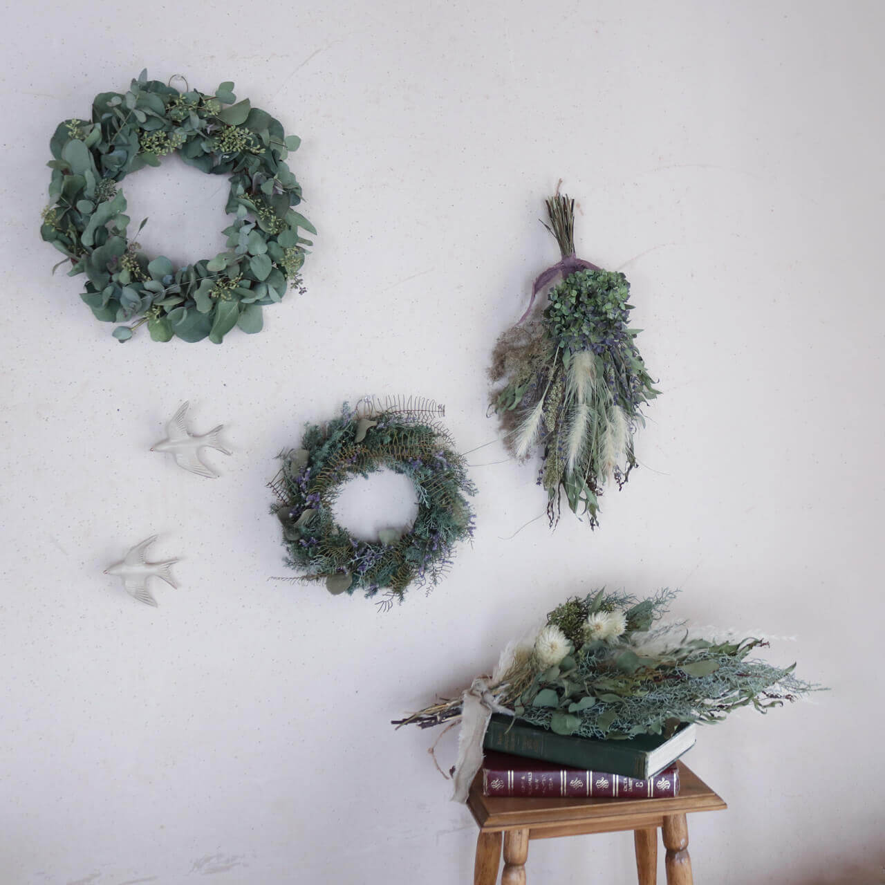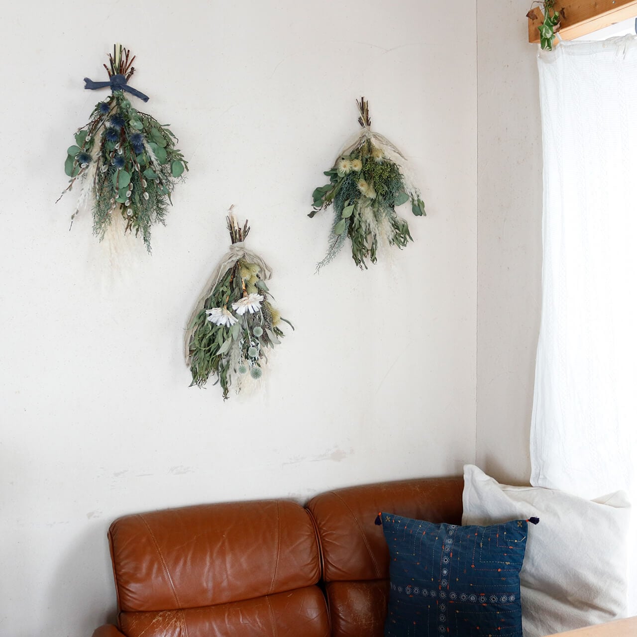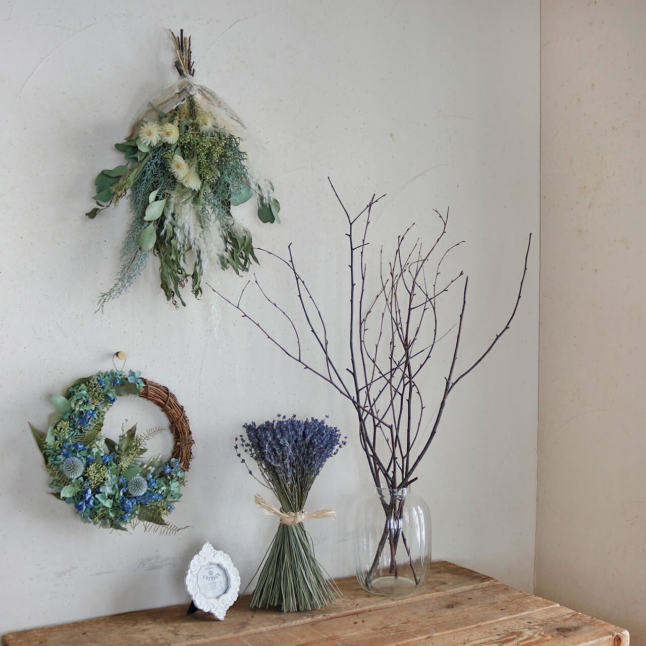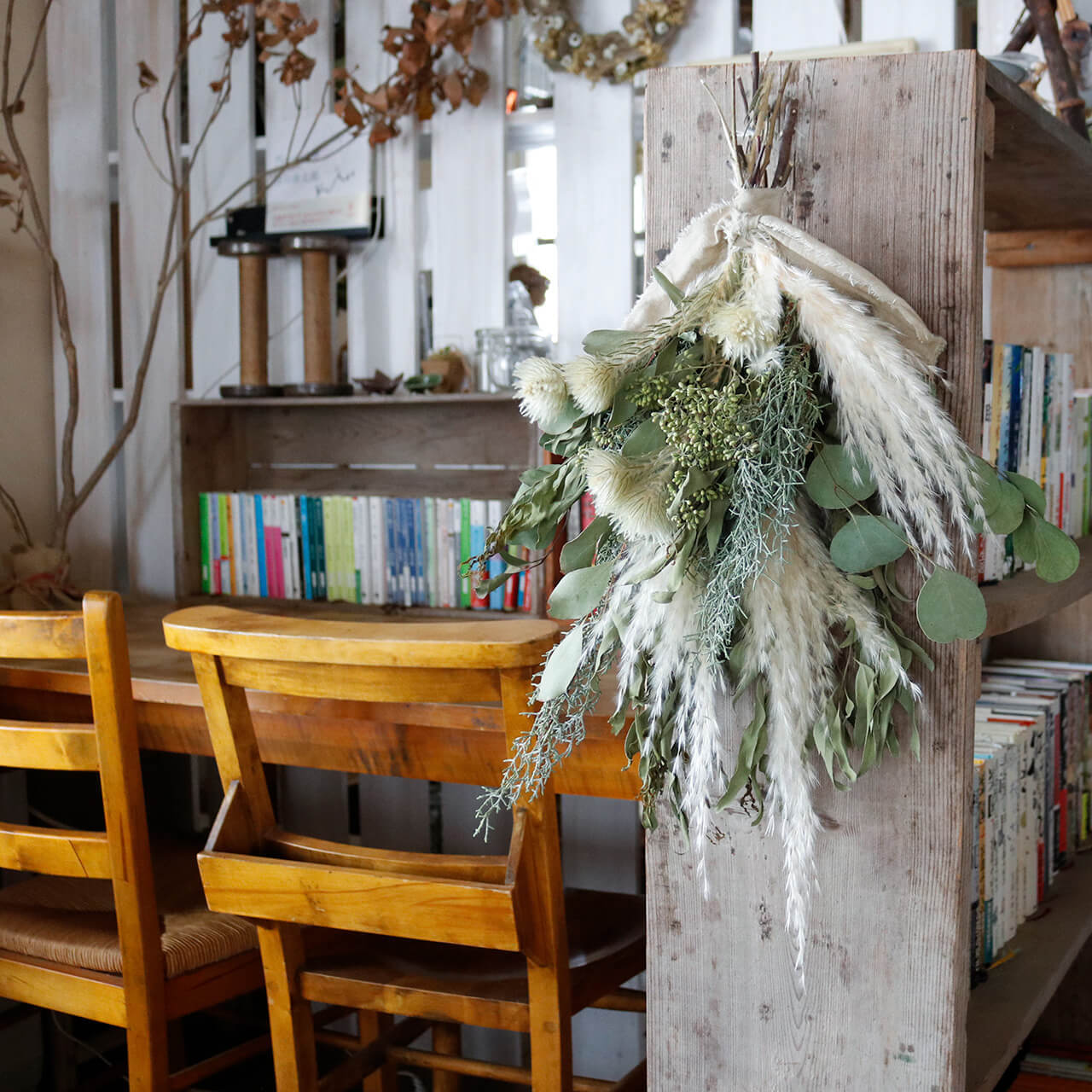 ドライフラワーグリーンや枝物とあわせてお部屋をナチュラルヒュッゲな北欧インテリアに。