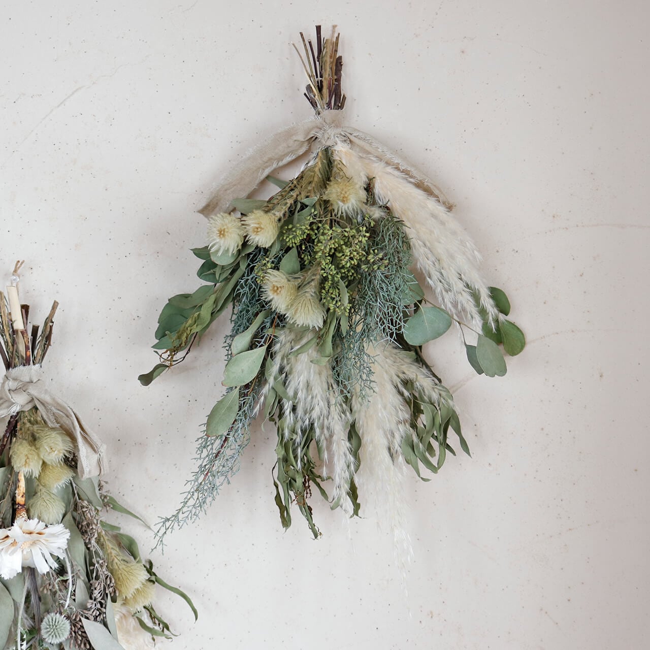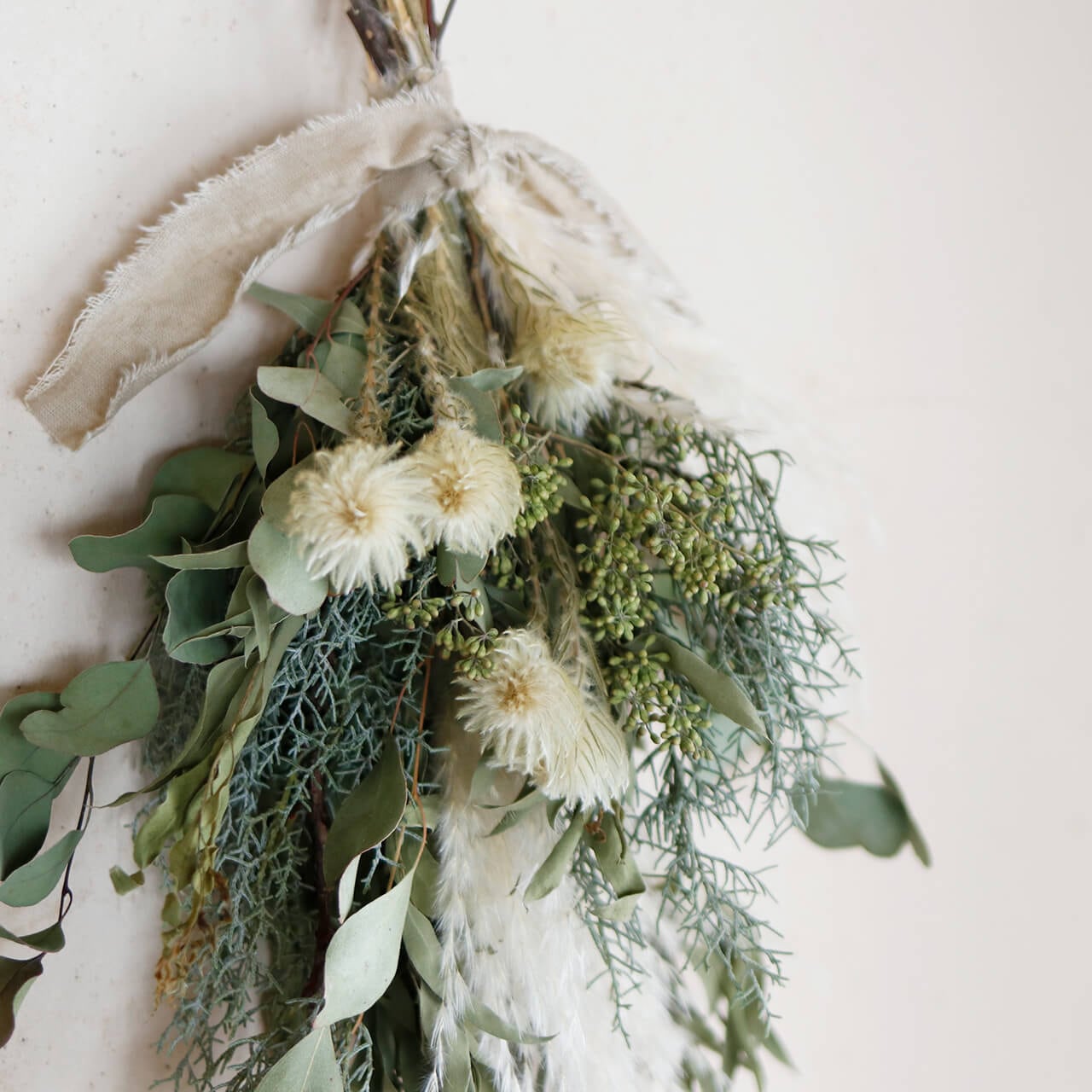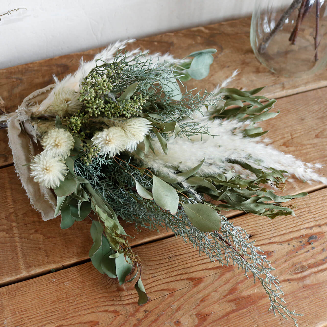 【1点もの】 5種のグリーンとパンパスグラスの大きめボタニカルドライフラワースワッグ * ドライフラワー ブーケ 北欧インテリア 開店祝い 誕生日 ギフト ナチュラル かわいい ボタニカル おしゃれ