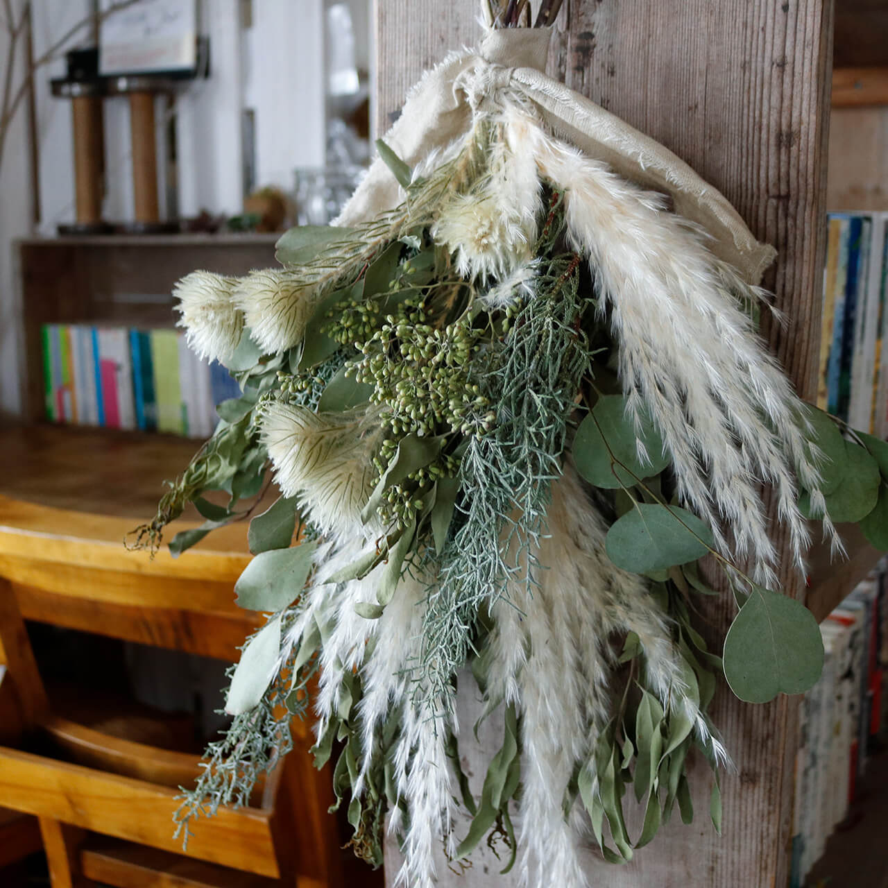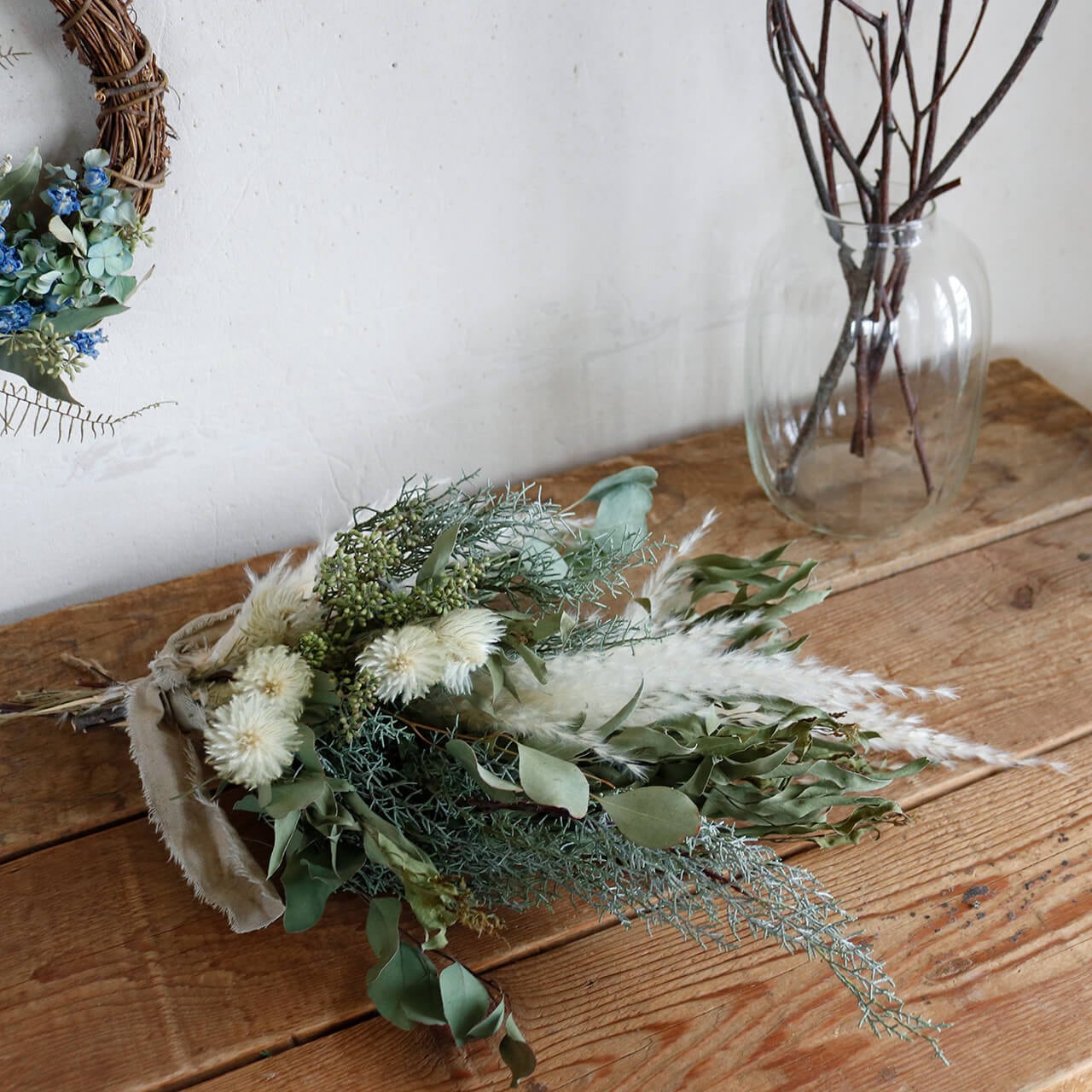 ・素材:フィリカプルモーサマルチ・ユーカリポポラスベリー・ユーカリニコリ・ユーカリポポラスリーフ・ブルーアイス・パンパスグラス(ドライフラワー)