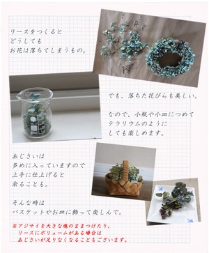 ●画像のような細身のあじさいのリースができる分量のあじさいが入っています。花のつけ方によってはアジサイが足りなくなることがございます。説明書をよくお読みになってお作り下さい。