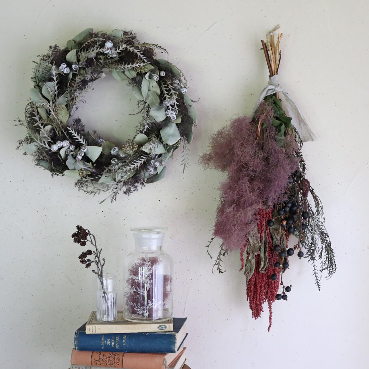 グレイッシュなリースやくすみカラーのスワッグと合わせて秋冬インテリアをおしゃれに。