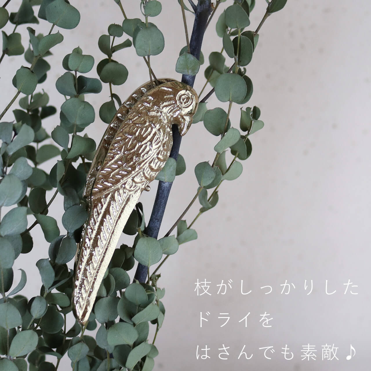 ナンキンハゼの木やグニーユーカリのようなしっかりとした枝ものドライフラワーをはさむとオウムがとまっているようにも見えます。