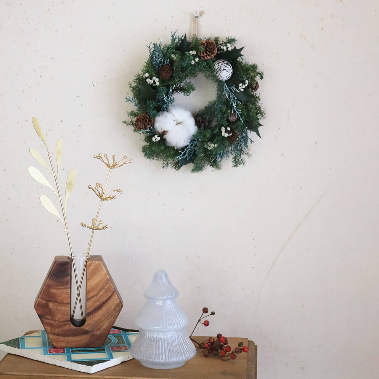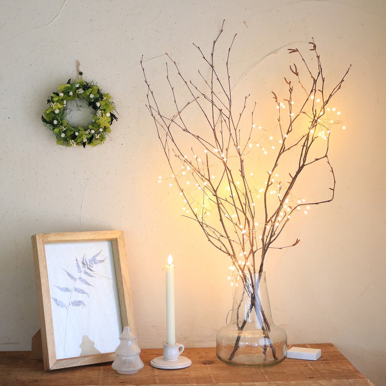 野バラの実や白樺の枝などのドライフラワーと合わせて飾ったり、LEDライトと合わせて飾ってもおしゃれ。
