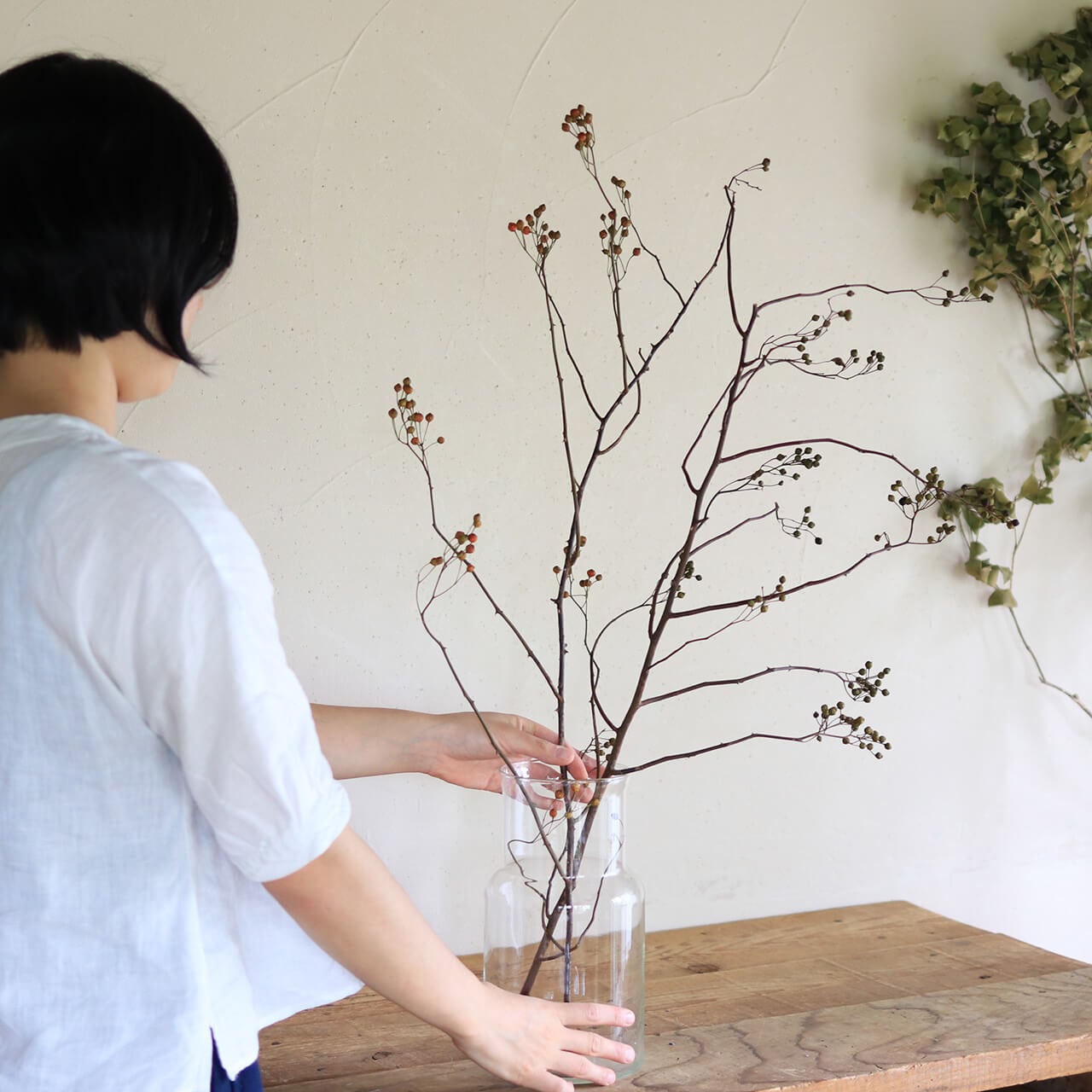 枝ぶりが美しく見えるよう低めのフラワーベースに飾ったり、リボンや麻紐をまいてブーケにしたり、シックでナチュラルなインテリアやボタニカルなディスプレイに大活躍♪