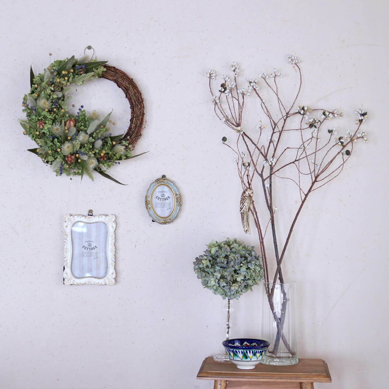あじさいやアナベル、クラスペディアなどのドライフラワーが良く似合います。