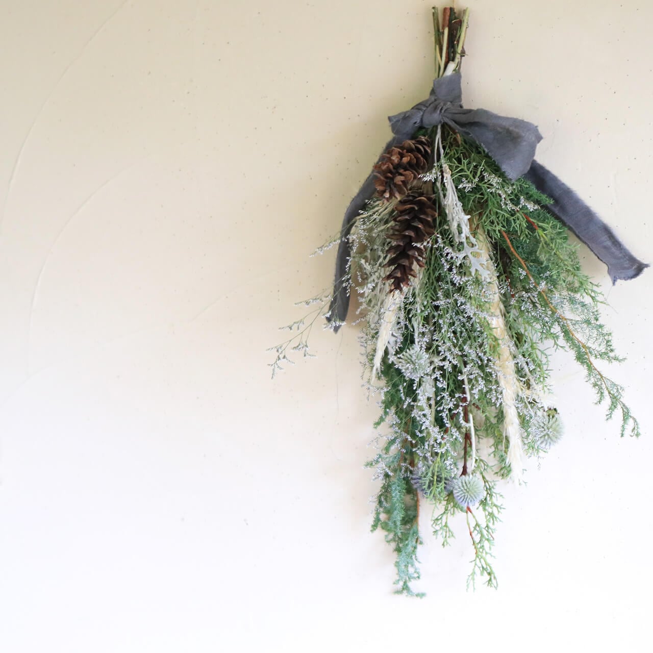 クリスマスブーケ ホワイト * ドライフラワー 深い針葉樹のグリーンにシルバーリーフやパンパスグラスのナチュラル大人かわいいクリスマススワッグ