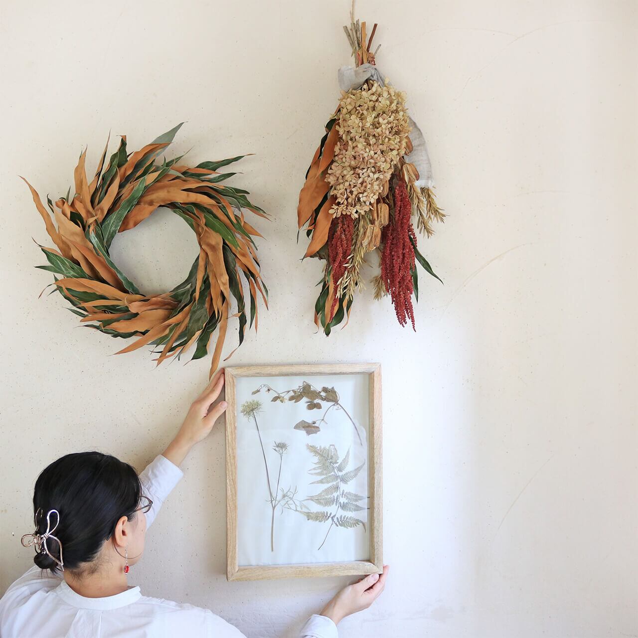 ドライフラワーグリーンや枝物とあわせてお部屋を落ち着いた雰囲気のヒュッゲな北欧インテリアに。