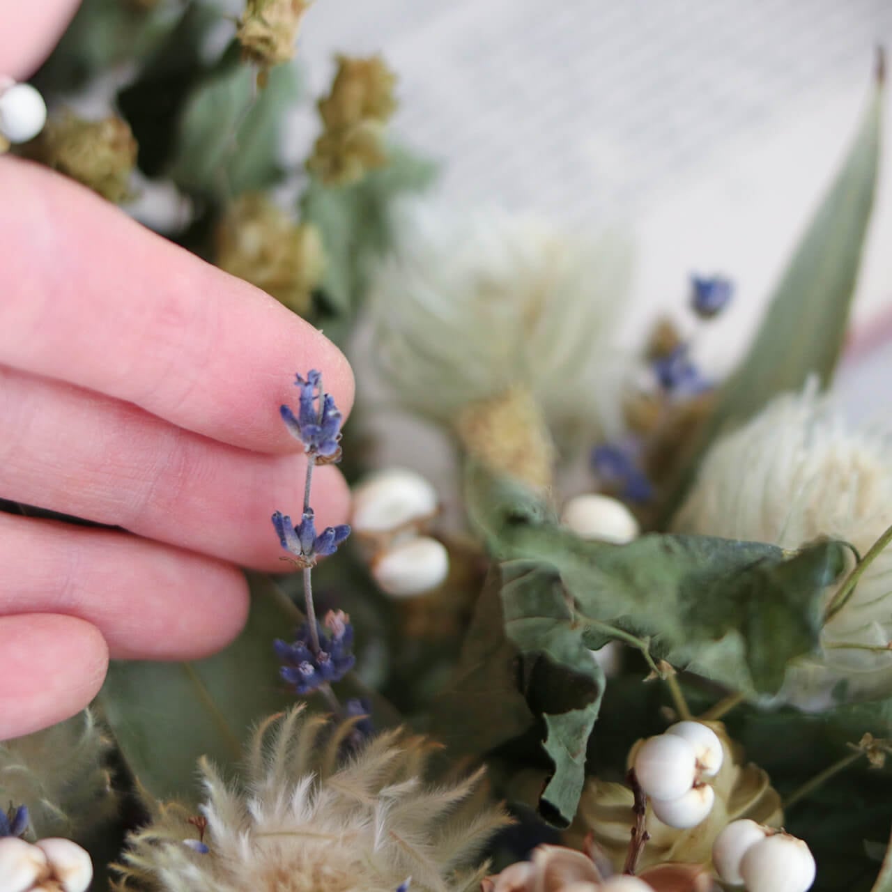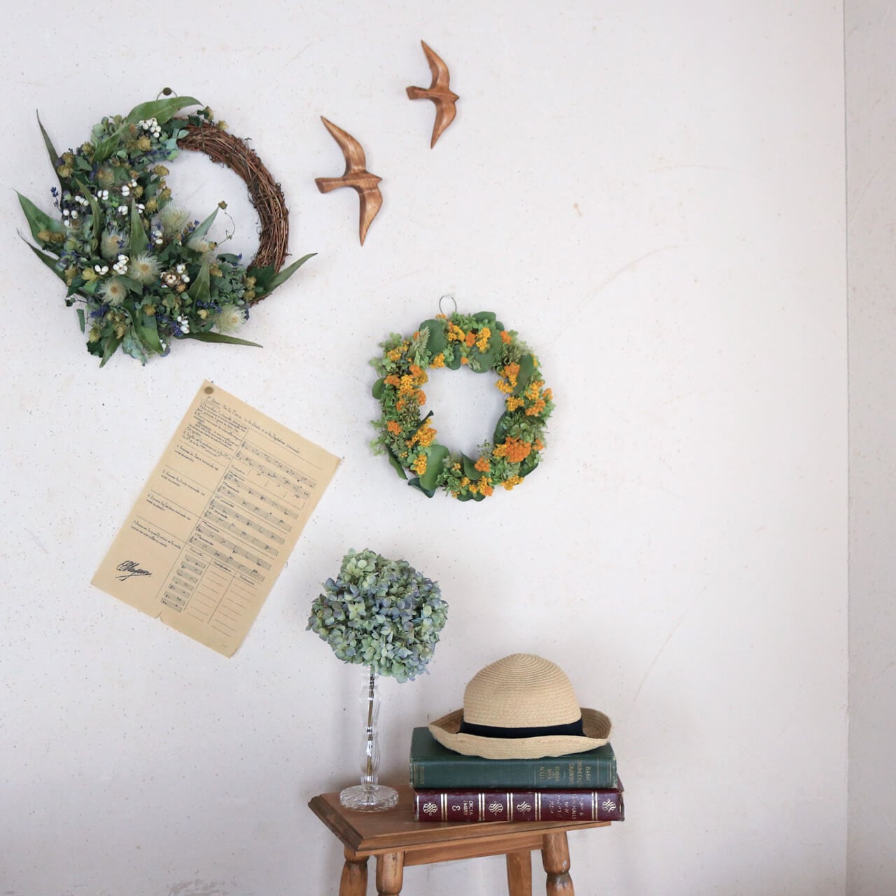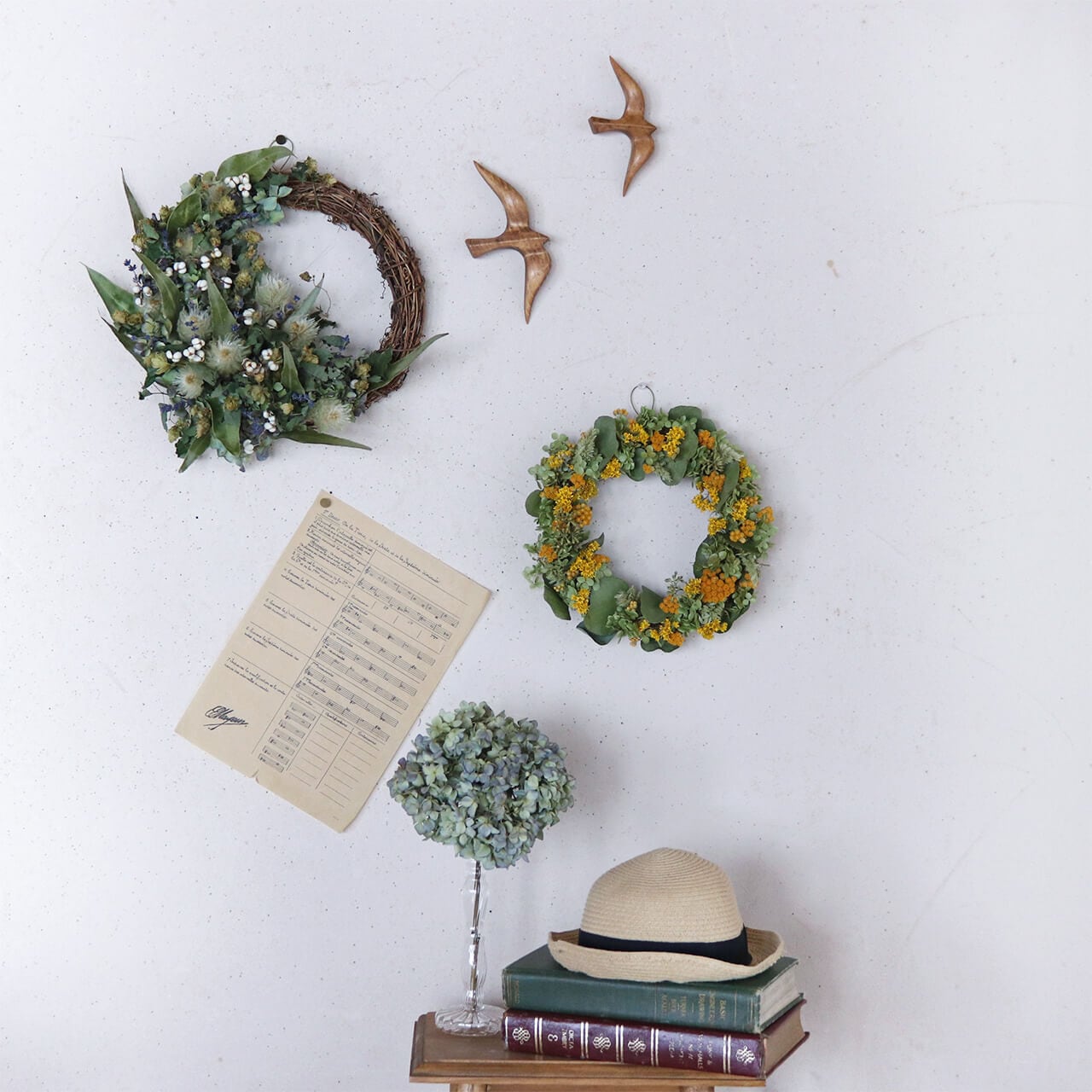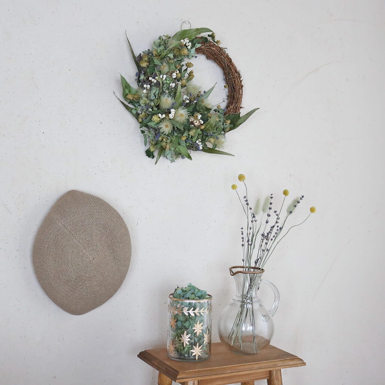 ドライフラワーグリーンや枝物とあわせてお部屋をナチュラルヒュッゲな北欧インテリアに。