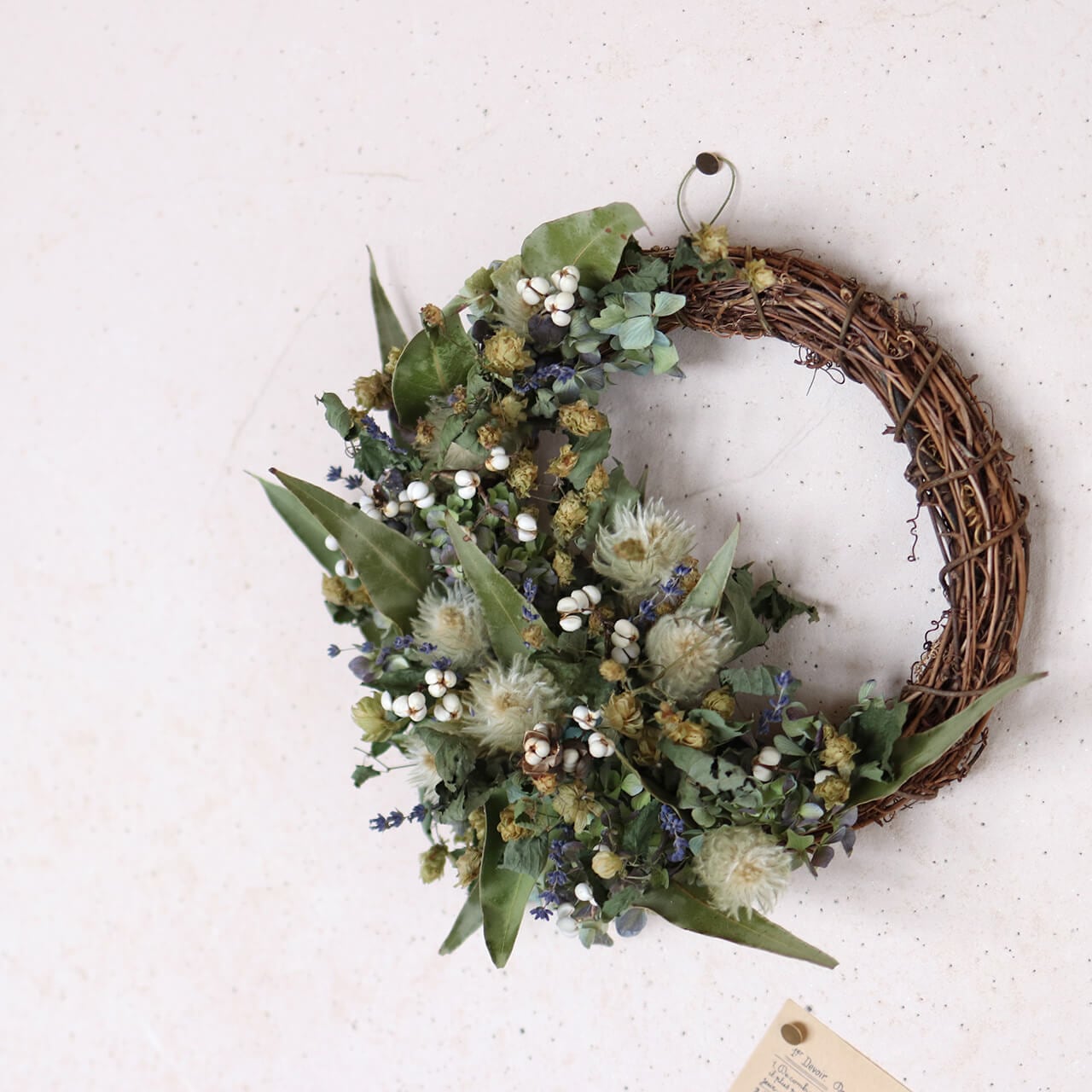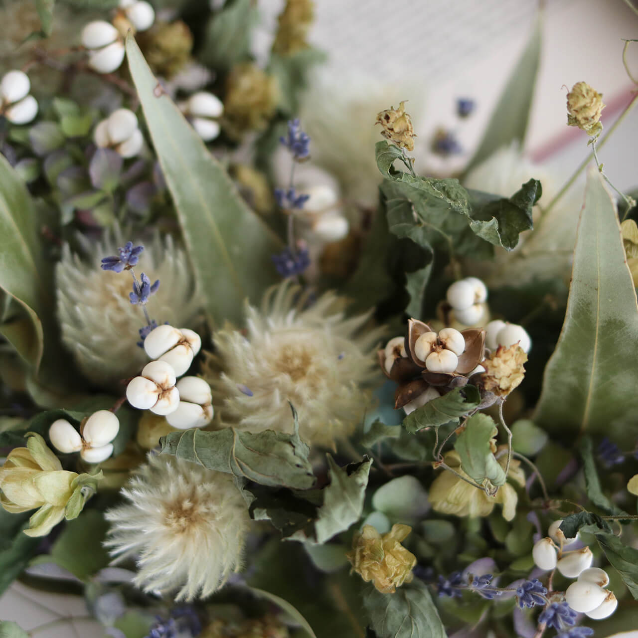 ●素材:フィリカプルモーサ・野生ホップ・ナンキンハゼの実・ユーカリロングリーフ・富良野ラベンダー4号おかむらさき・あじさい(ドライフラワー)