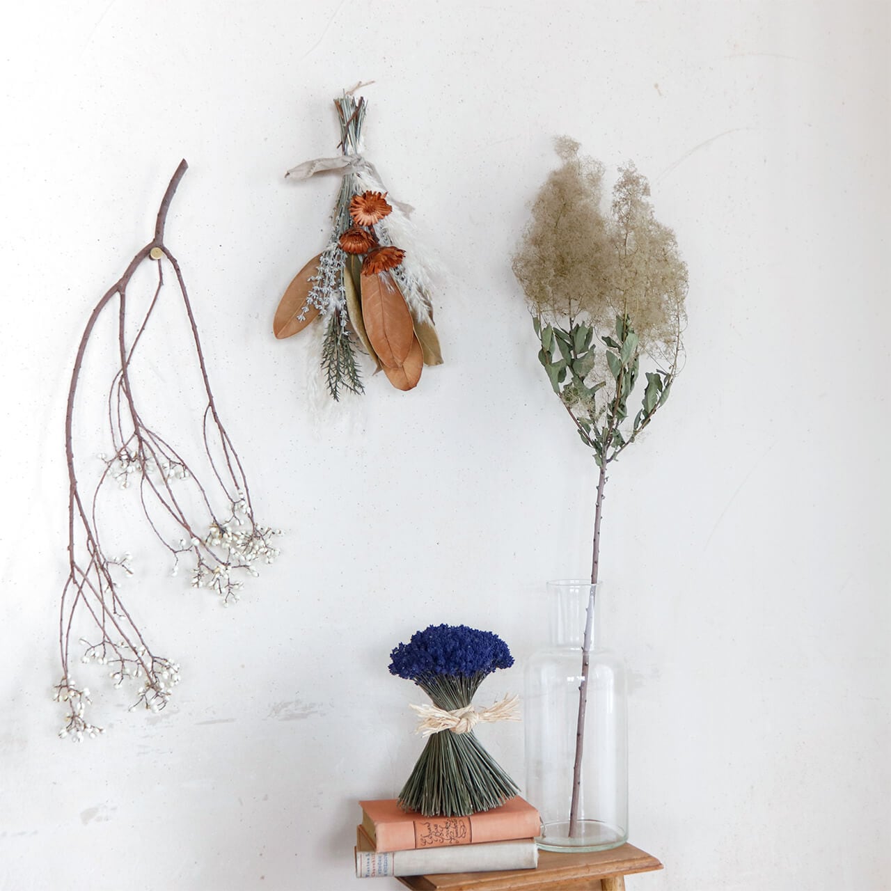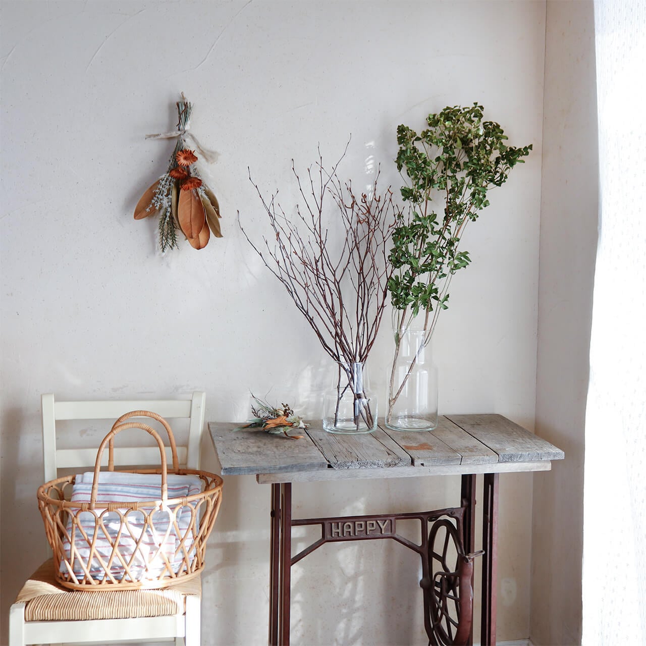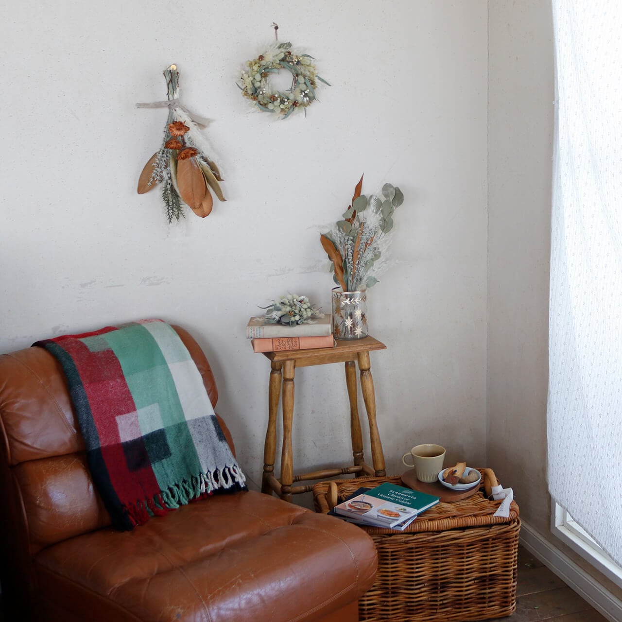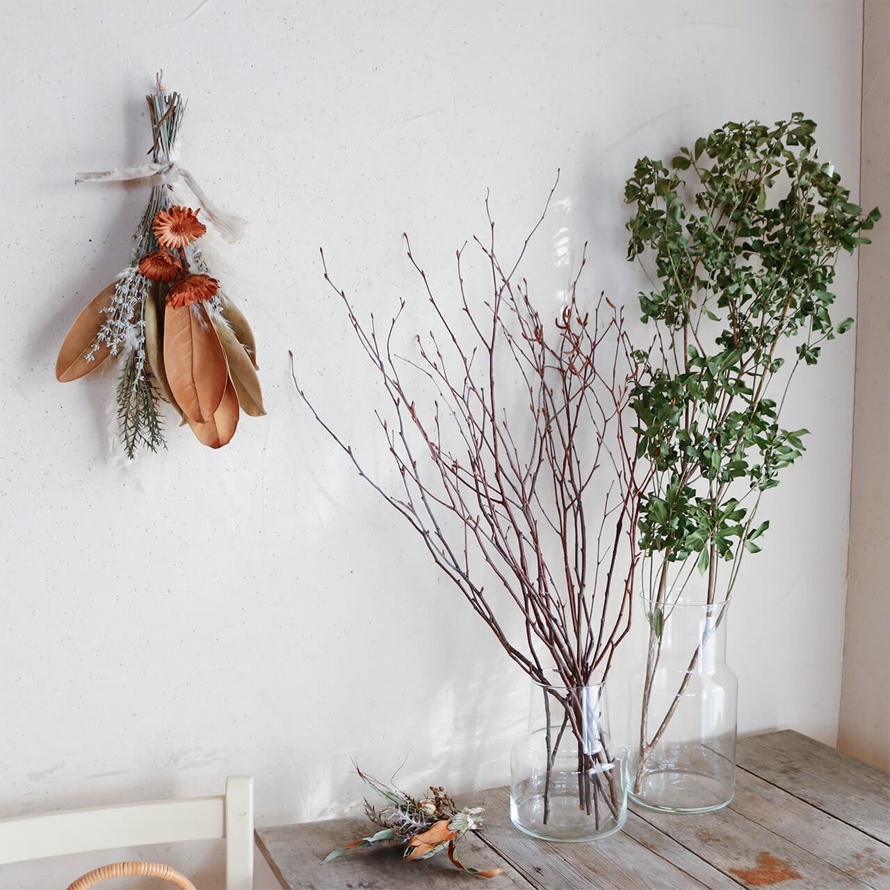 ドライフラワーグリーンや枝物とあわせてお部屋をナチュラルヒュッゲな北欧インテリアに。