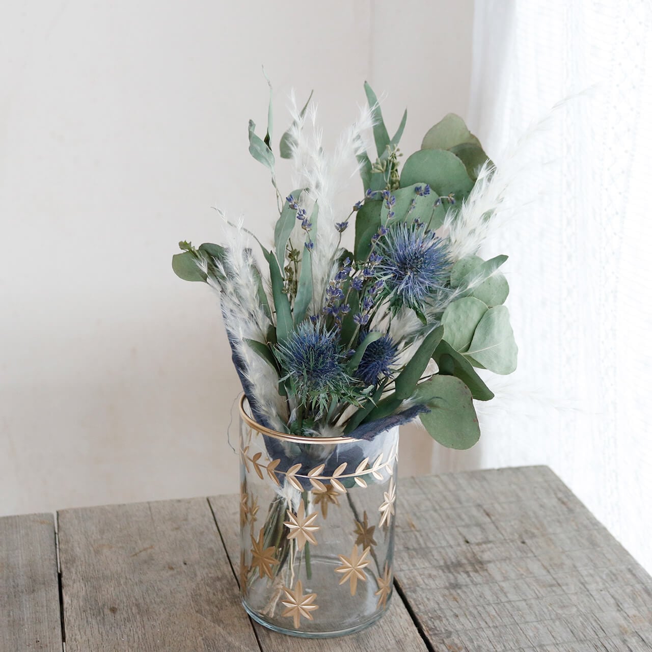 あじさいヘッドやユーカリ、アジサイが似合う円柱形のガラスベース。