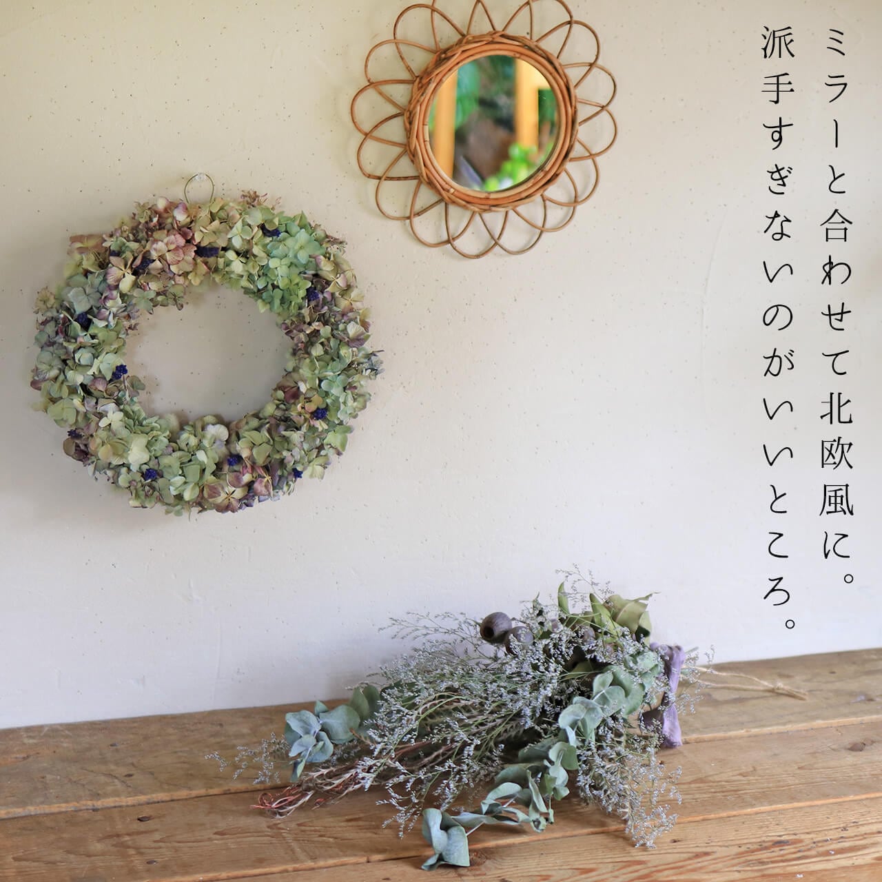 サイズ違いのリースと飾ったり、あじさいグリーンアナベルやあせびなどのグリーンと合わせたりと飾り方は色々。