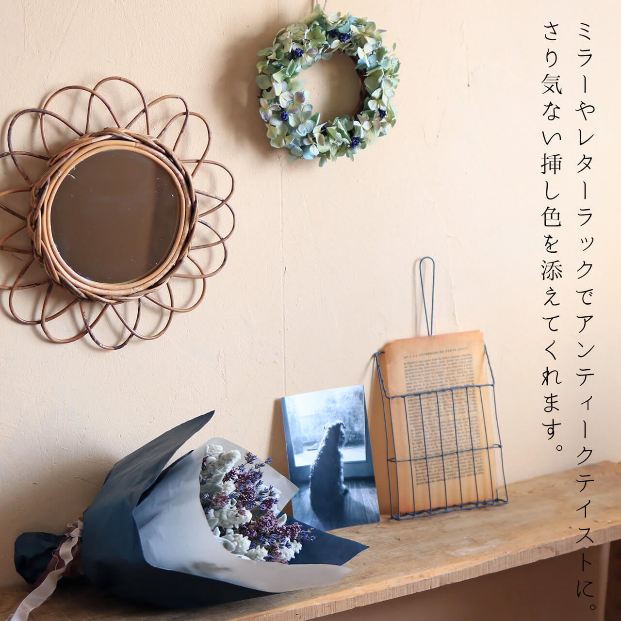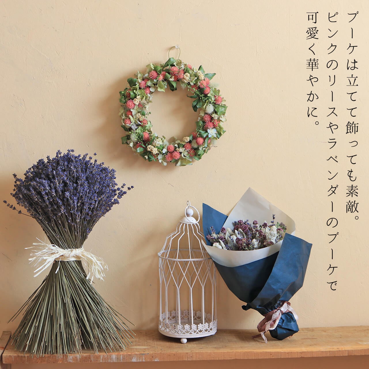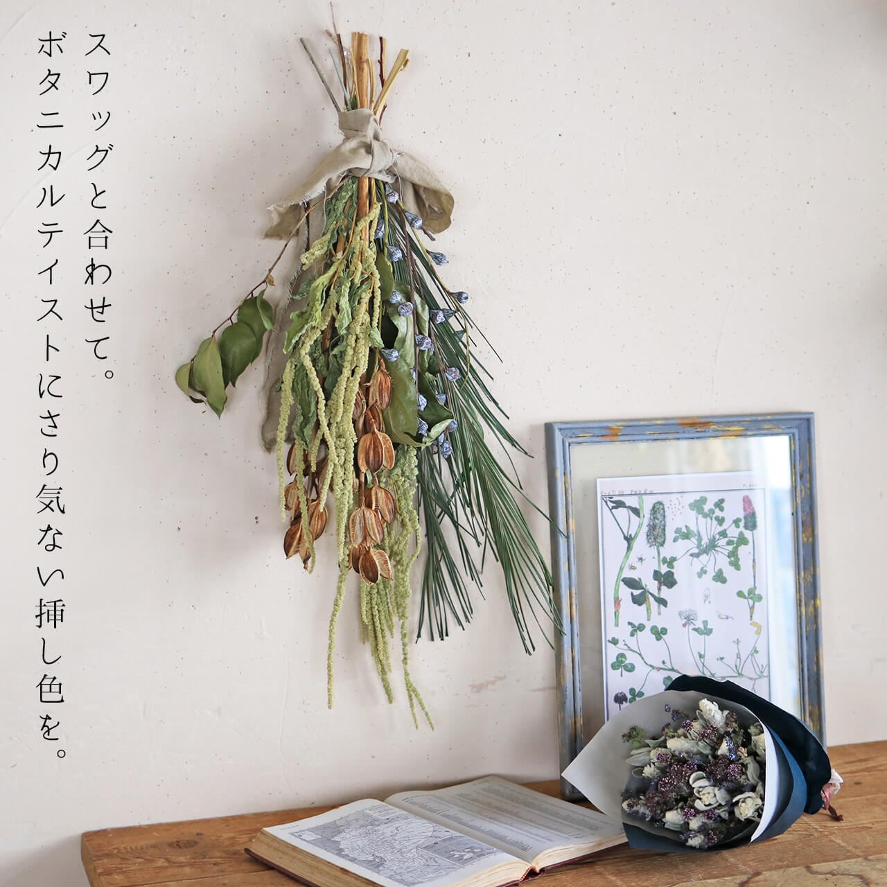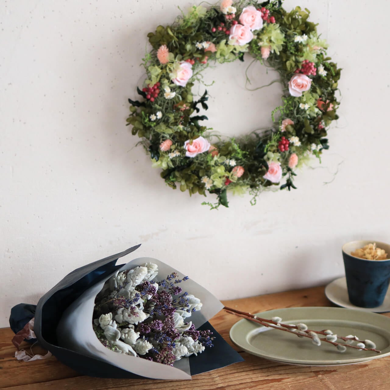 グリーン系のリースやブーケとあわせたり、白系の雑貨とあわせるとナチュラルでボタニカルな雰囲気に。