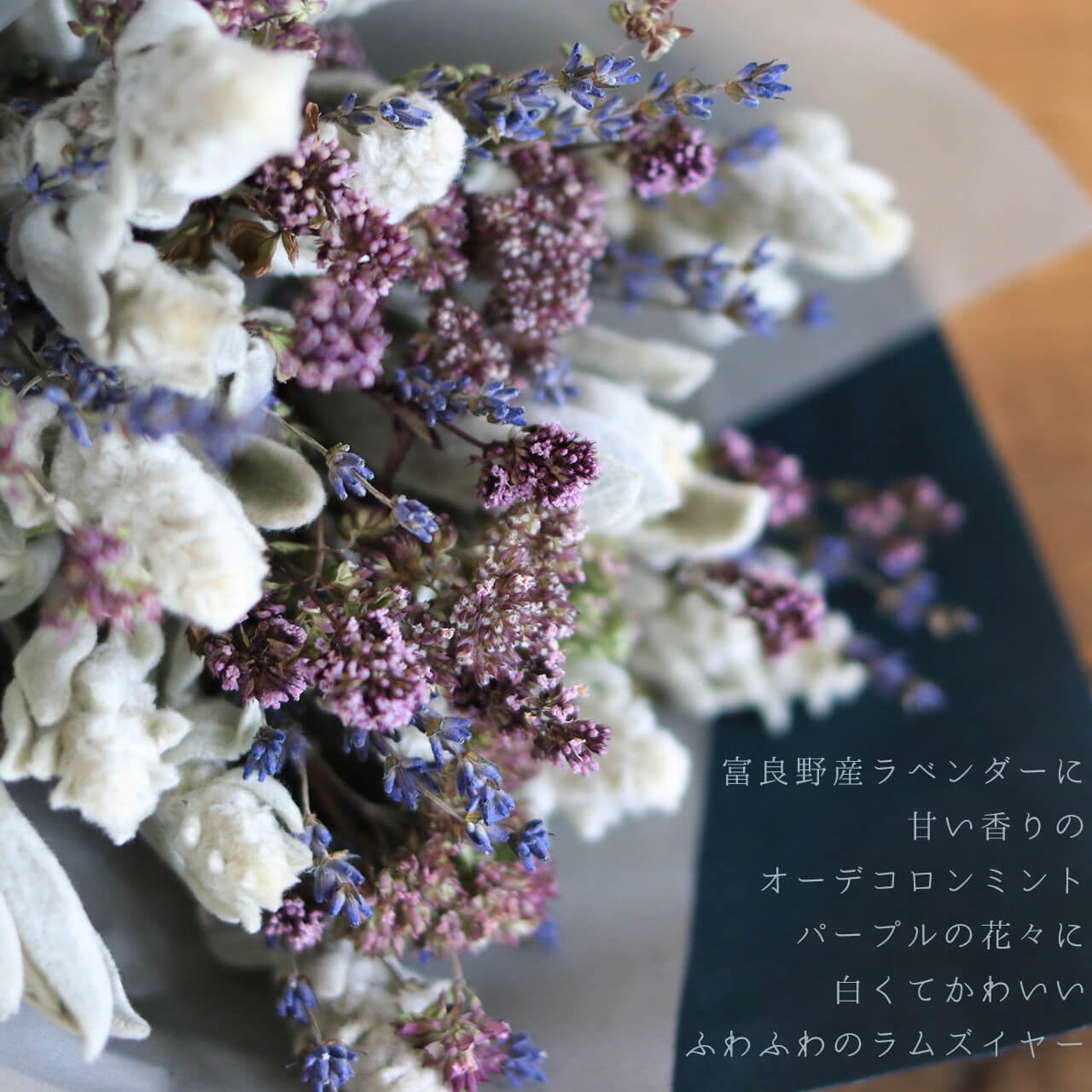 ふわふわかわいいシルバーリーフラムズイヤーに、ラベンダーやオーデコロンミント、オレガノなどのパープル系のお花をあわせたシンプルかわいいドライフラワーブーケです。