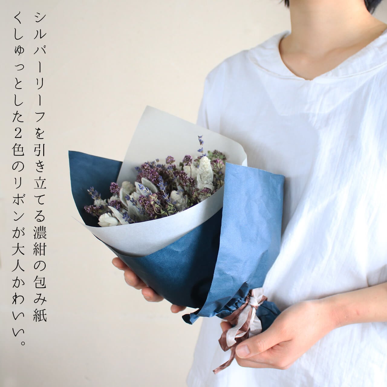 しなやかな濃紺と淡いグレーホワイトのラッピングペーパーにくしゅっとしたアンティークカラーのリボンがアクセント。