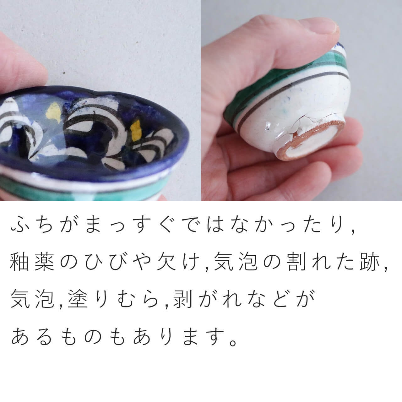 ・釉薬のムラ、黒点、色の擦れ、小さな欠けや傷、しわより、ひびなどがある事があります。