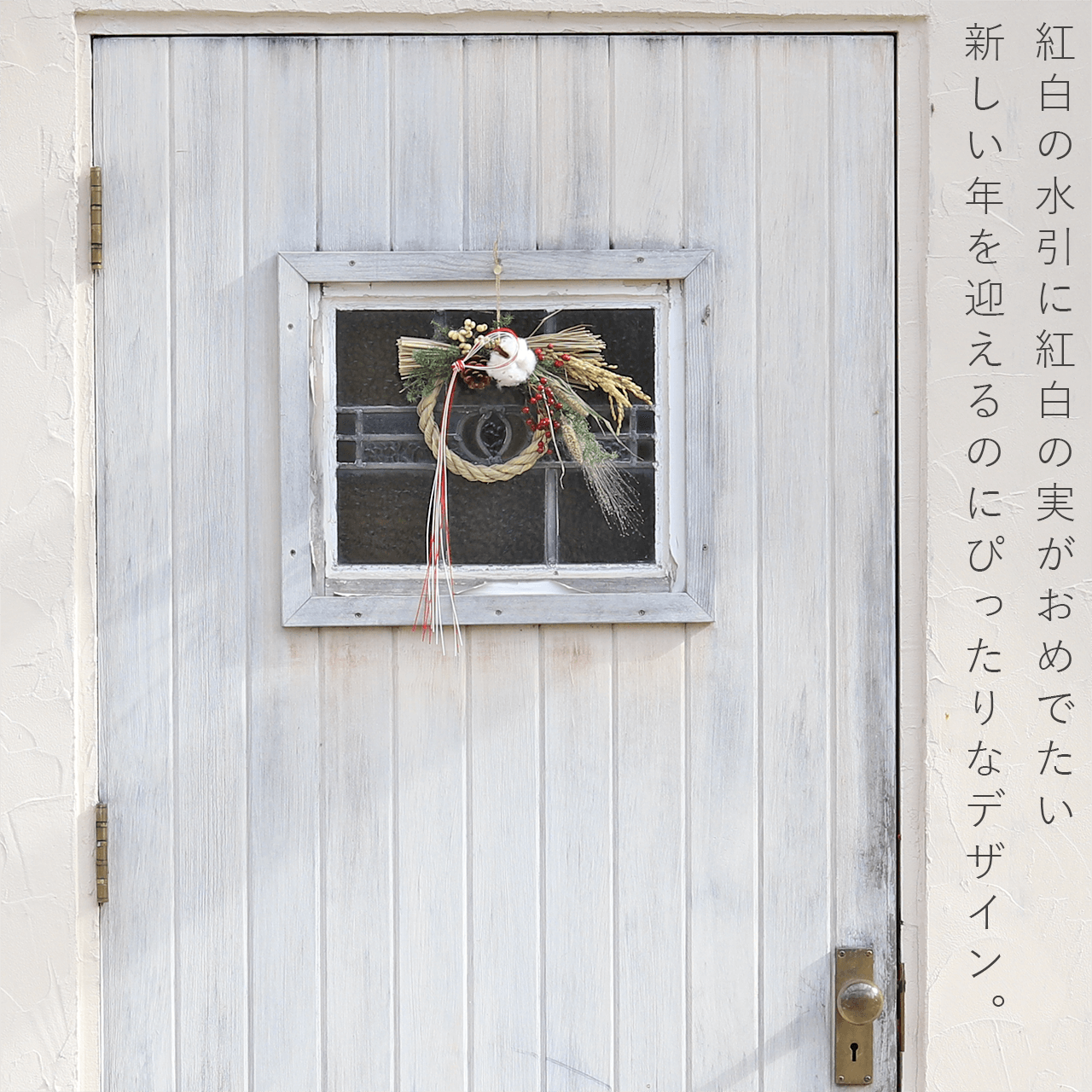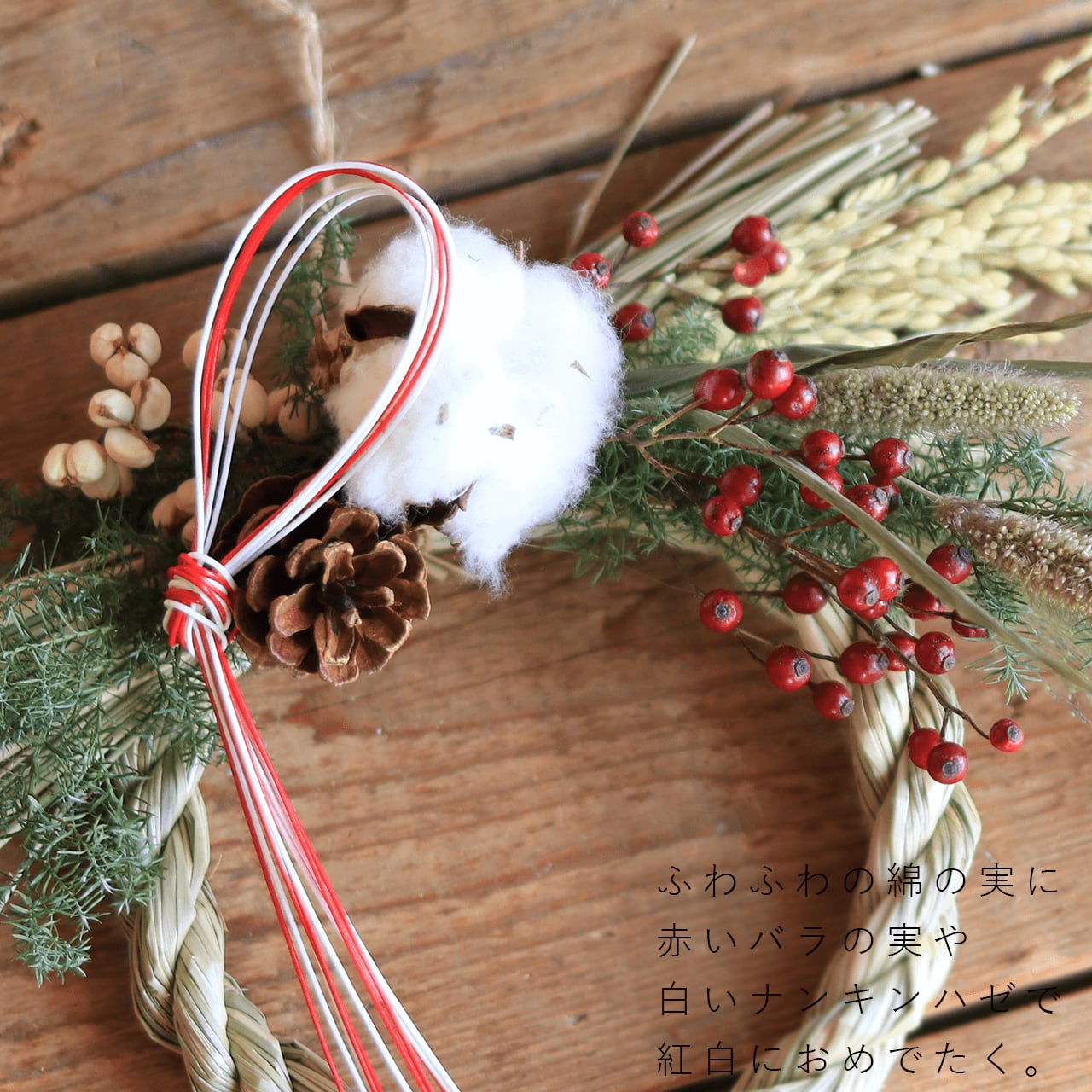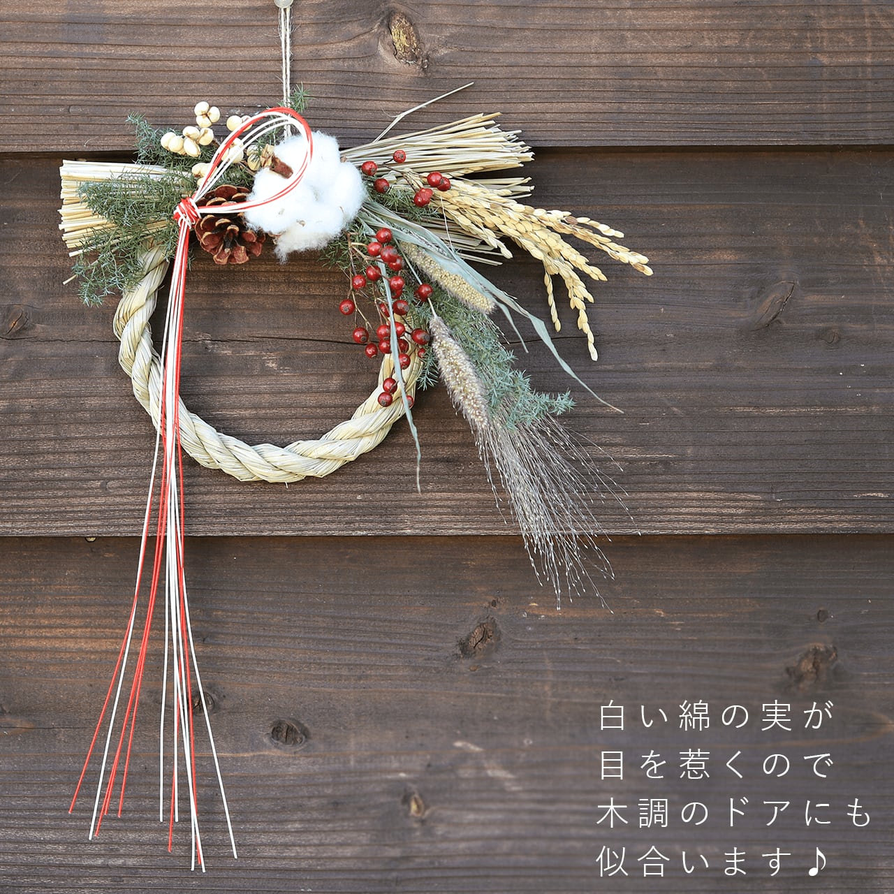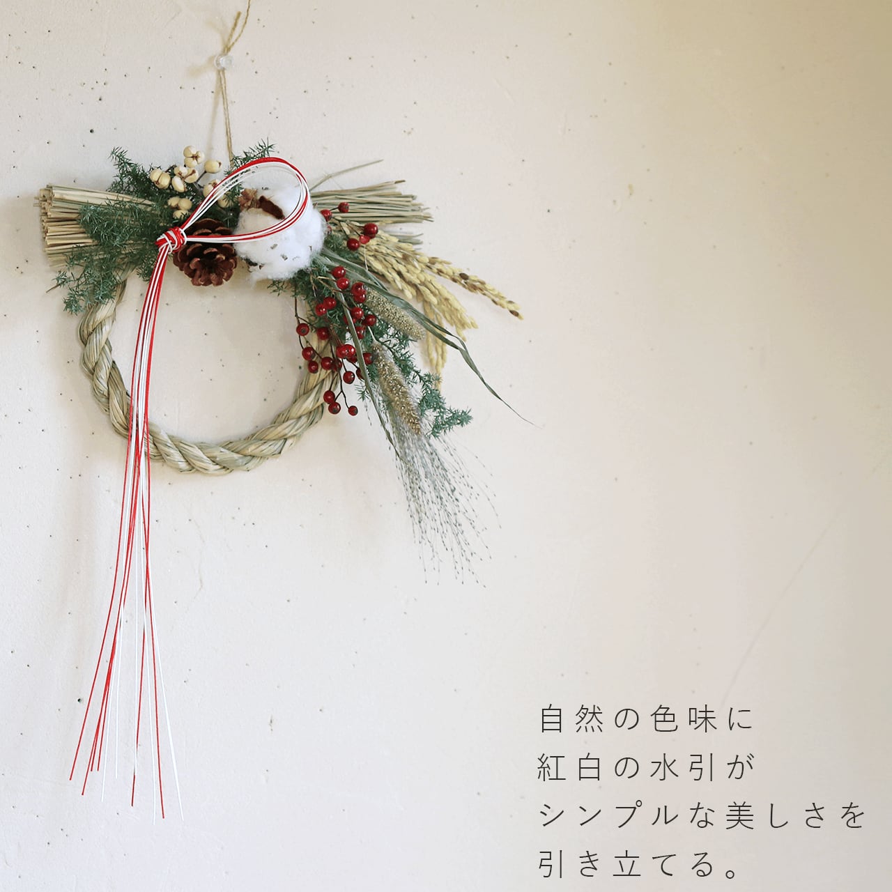 ドライフラワーならではの素朴でナチュラルな色合いが毎年人気のお正月しめ縄リース。