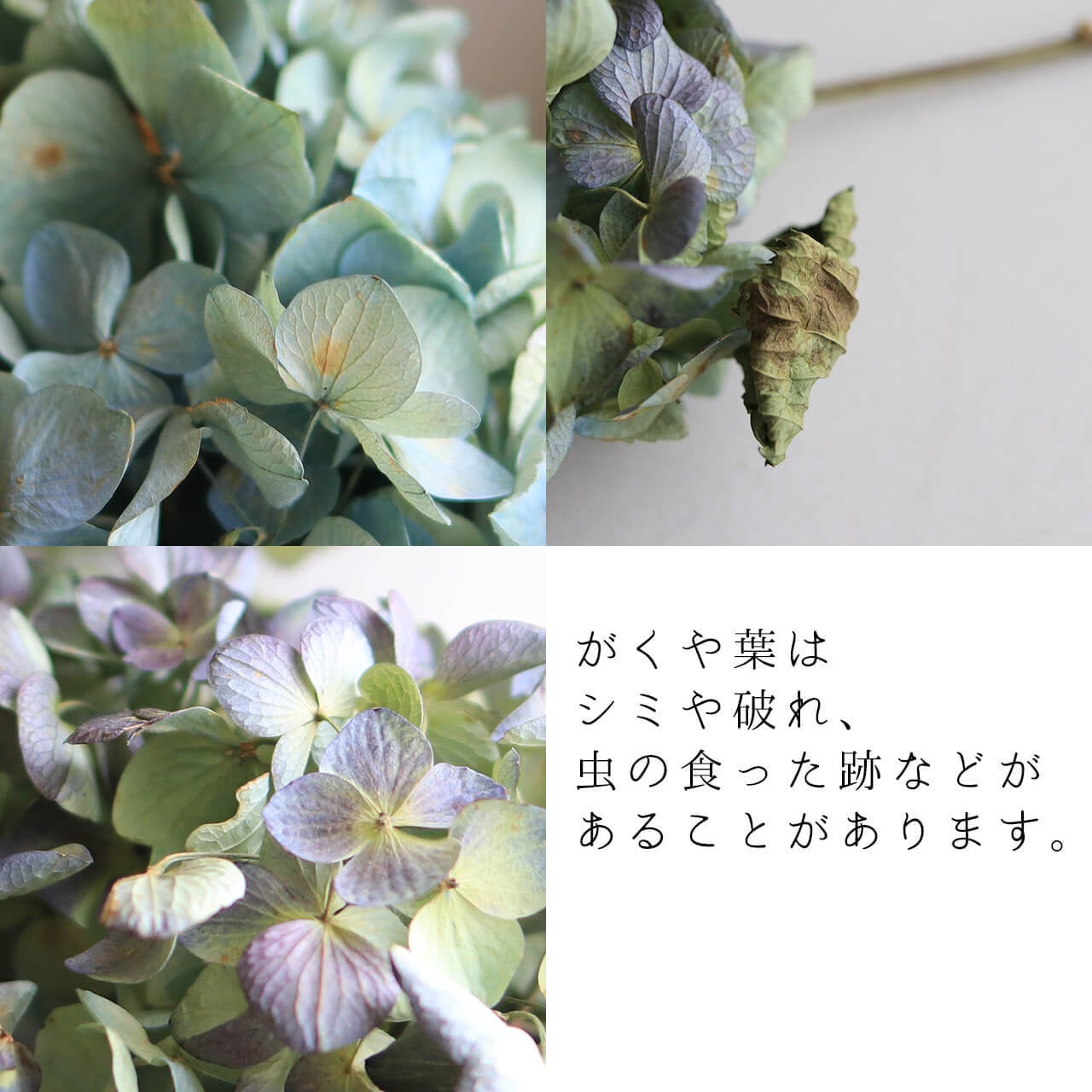 ●花や葉には茶色くなった部分やくしゃくしゃになった部分、枝、虫の食った跡があるもの、傷、汚れが混じることもあります。