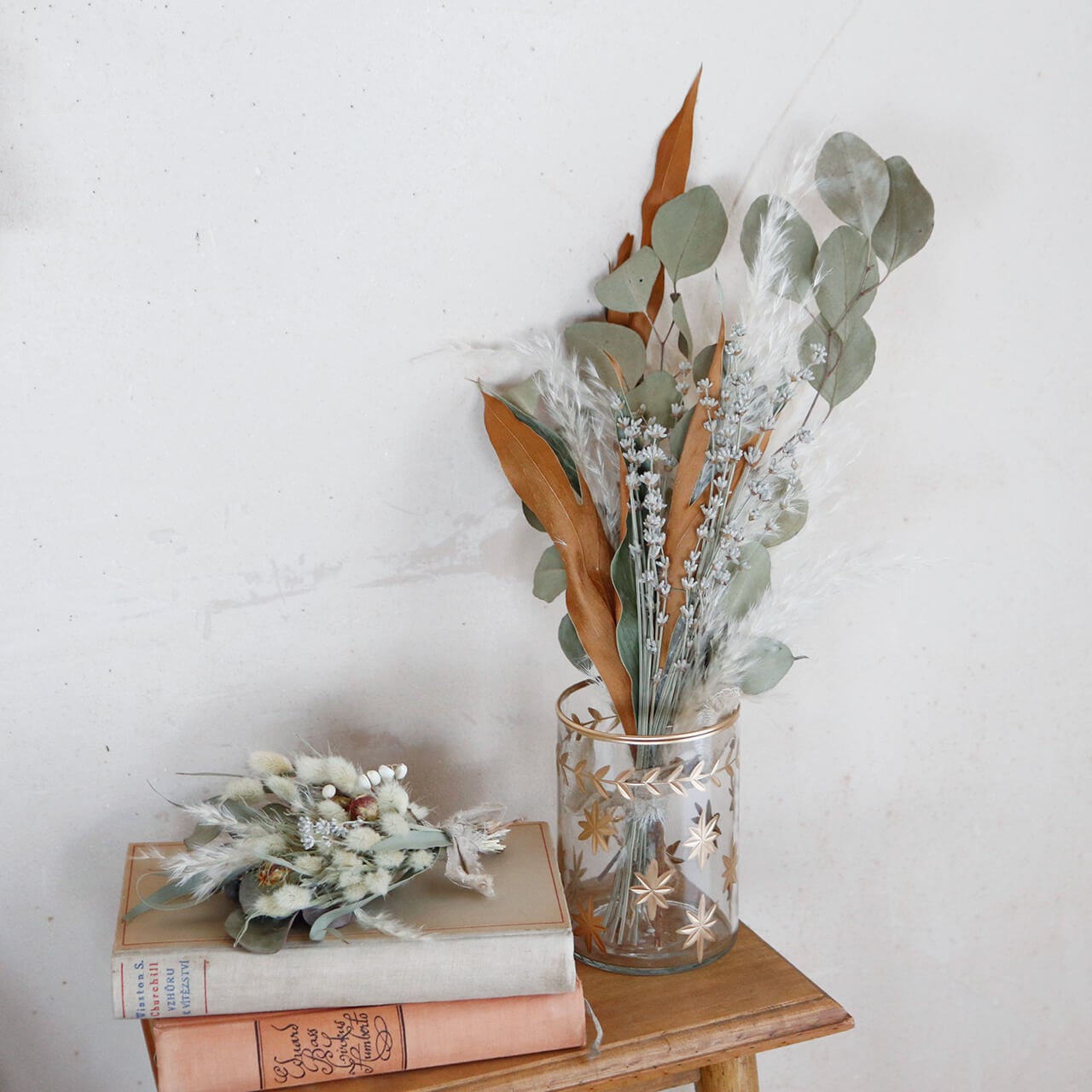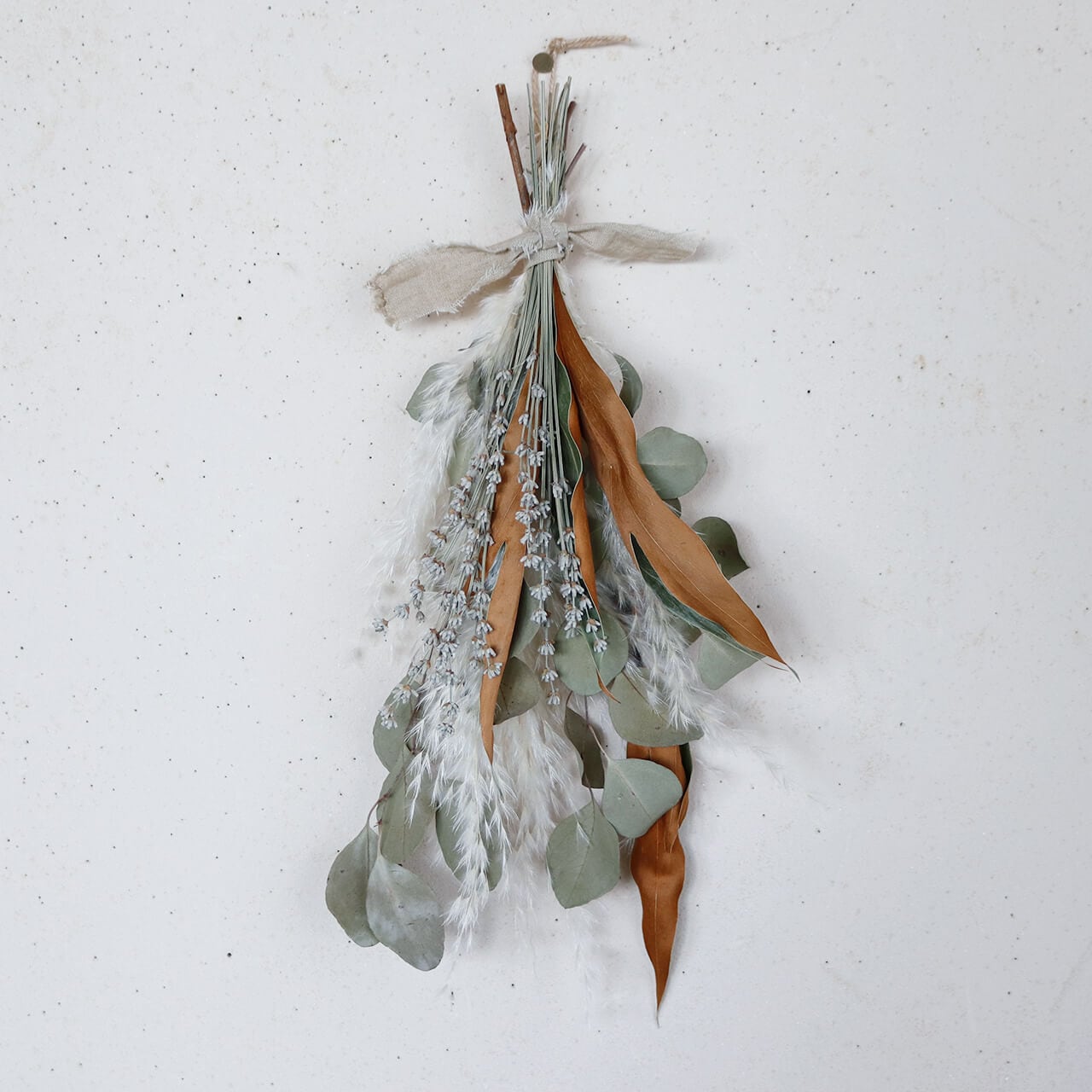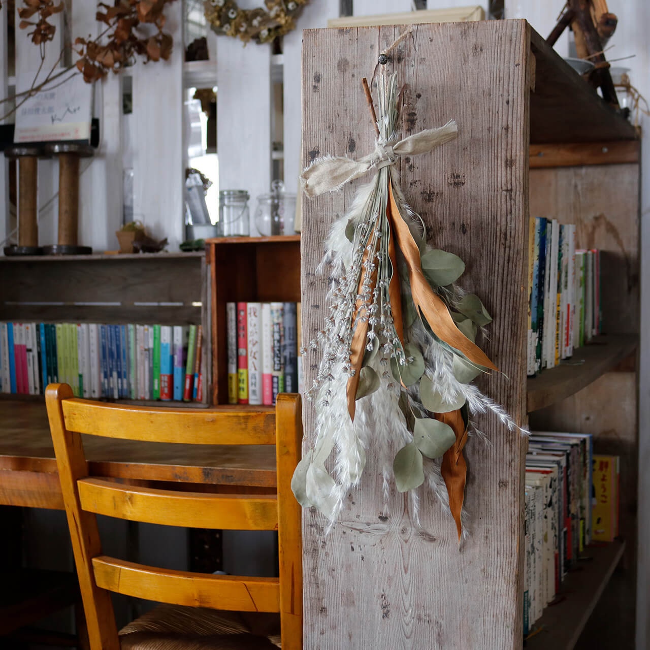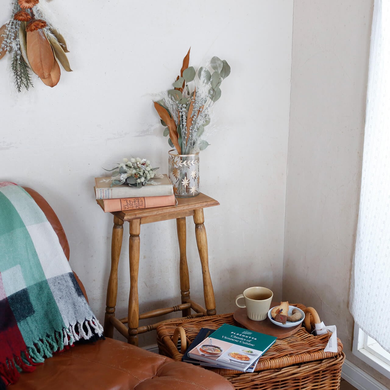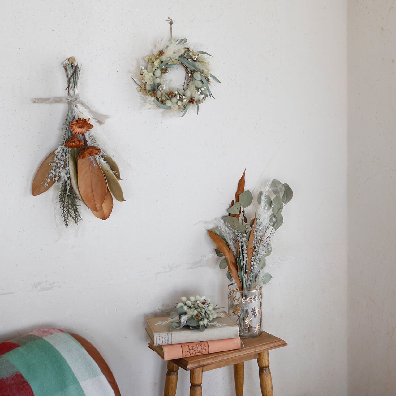 ドライフラワーグリーンや枝物とあわせてお部屋をナチュラルヒュッゲな北欧インテリアに。