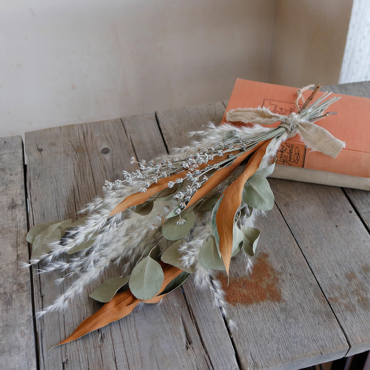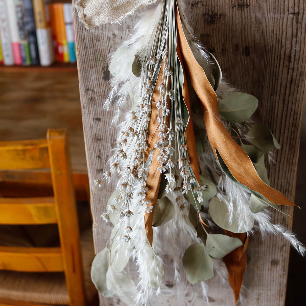 ・素材:富良野ホワイトラベンダー(グレイッシュラベンダー)・グレビレアゴールドリーフ・パンパスグラス・ユーカリポポラスリーフ(ドライフラワー)