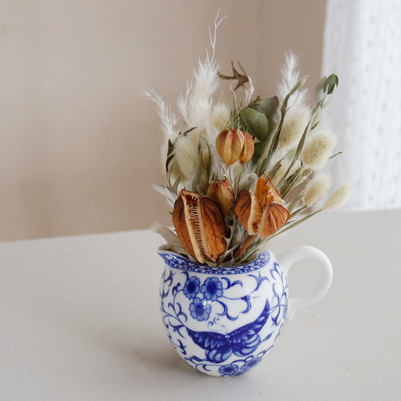 ●素材:ウバユリ・ニゲラ・ラグラス・パンパスグラス・ユーカリ銀世界・グレビレアアイバンホー・ネコヤナギ(ドライフラワー)