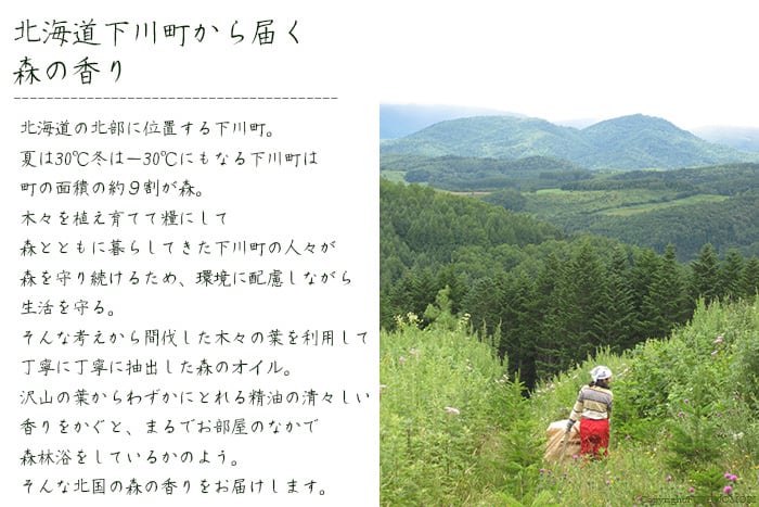 ・香り:霧深く清涼で幻想的な森の香り -ライケン-トドマツの森のしっとりとして清涼な空間を思わせる。(主な個あり成分トドマツ、ベルガモット、ユーカリ、ライム、シダーウッド、パインシルベスタ)