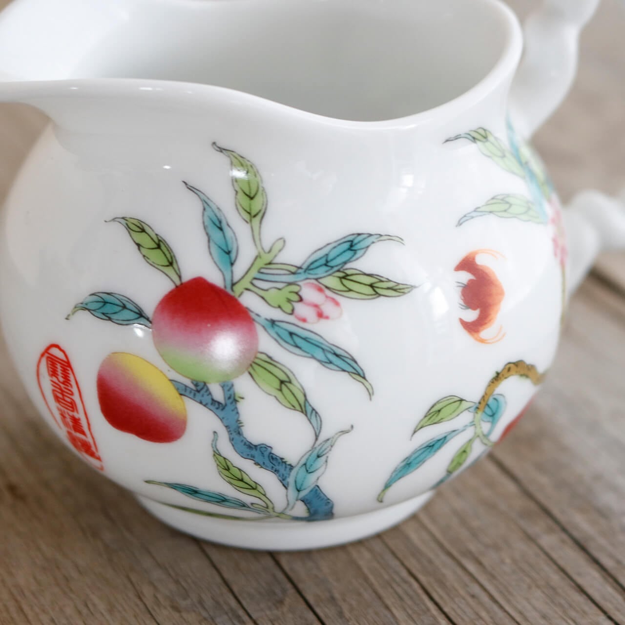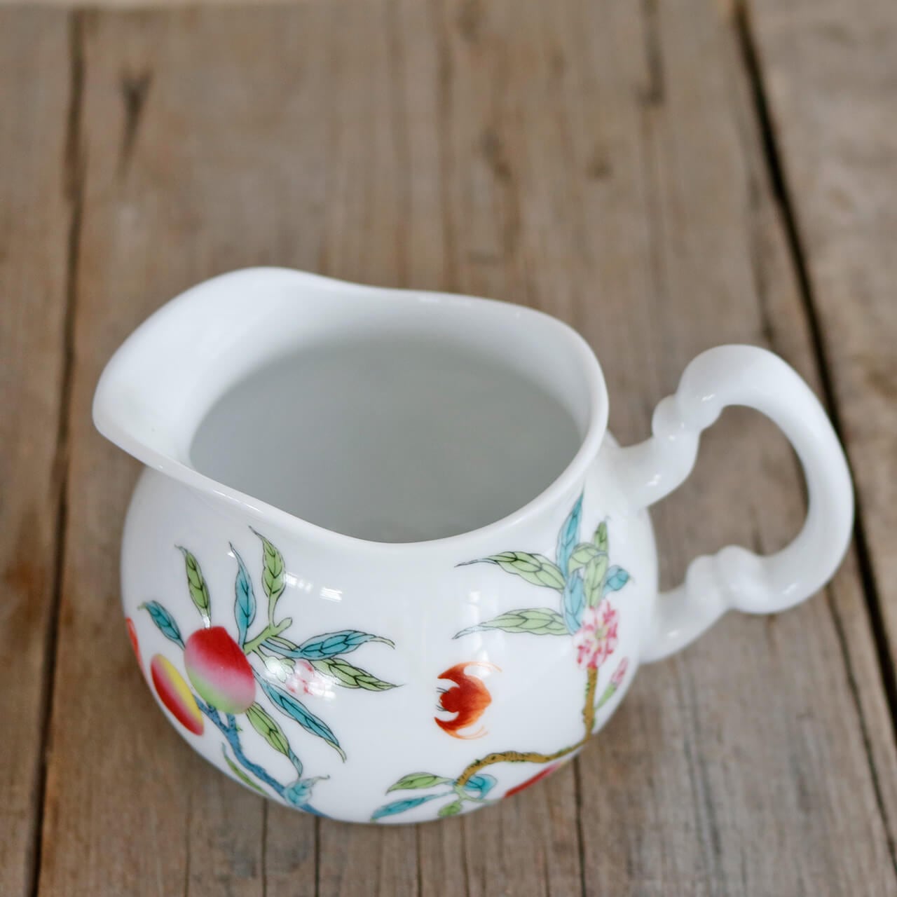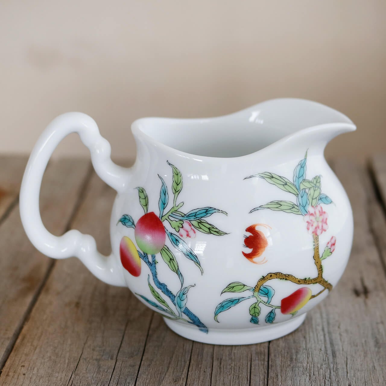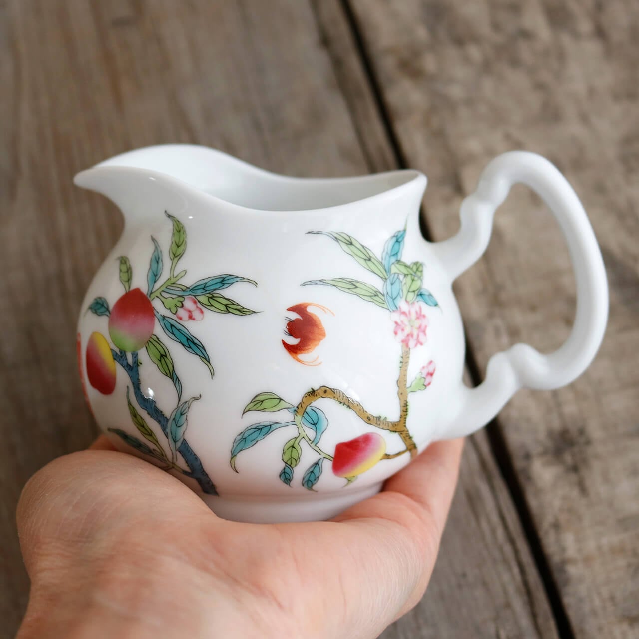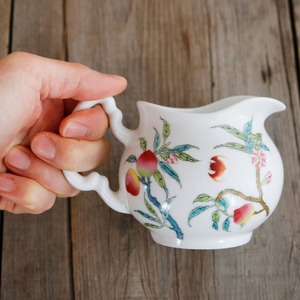 桃に桃の花・蝙蝠、吉祥おめでたい柄がかわいい陶器製ミニピッチャー。