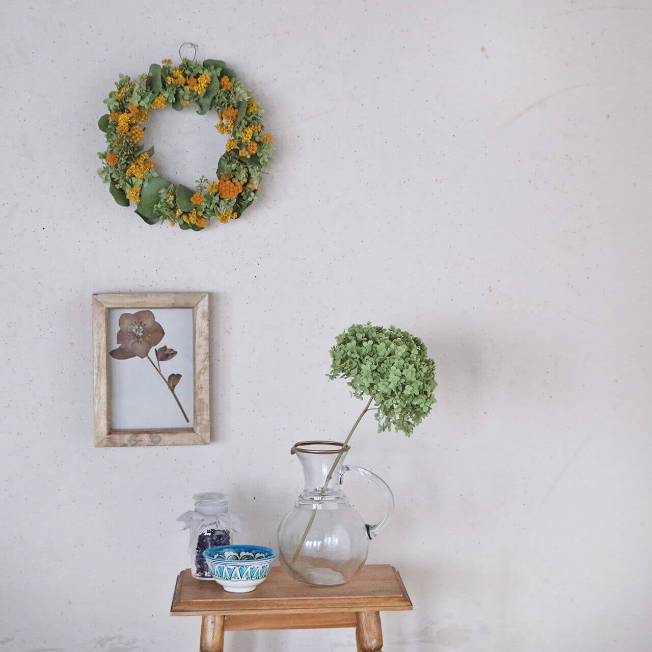 アジサイやクラスペディア、ユーカリなどのドライフラワーが良く似合います。