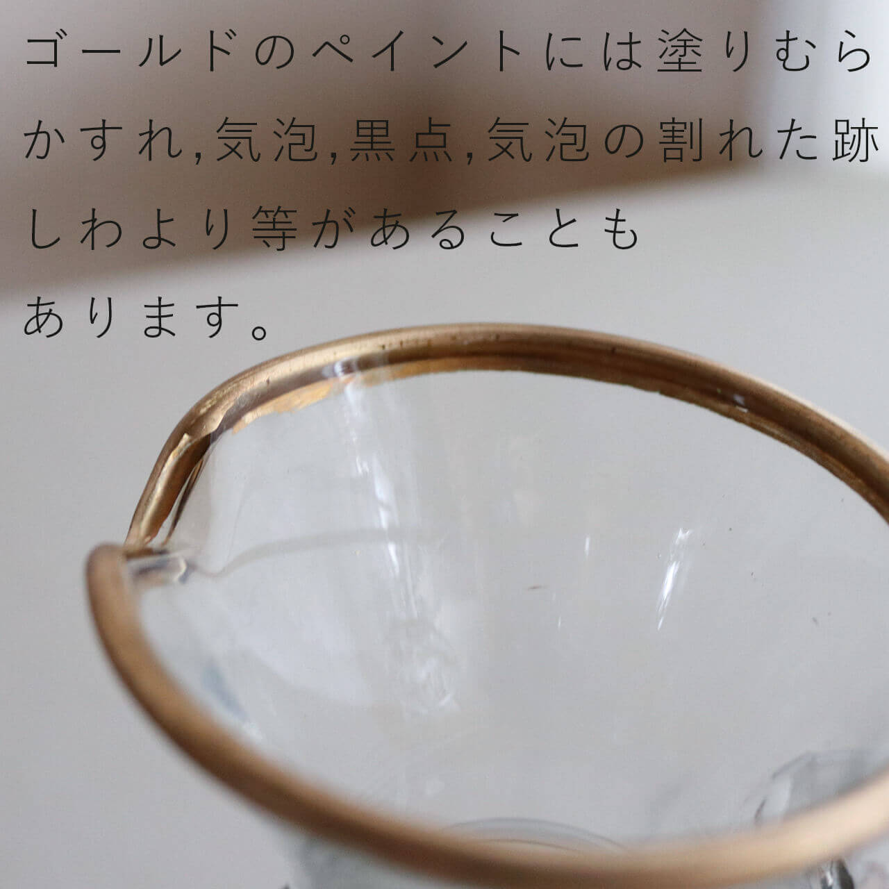 ・リサイクルガラスを使用した吹きガラス特有の気泡や白や黒の点、キズ、うねり、しわ等は製造工程上できるものです。底の中央に小さな丸い傷跡のようなものがありますが吹きガラスの製造工程上できる「ポンテ跡」と呼ばれるものです。